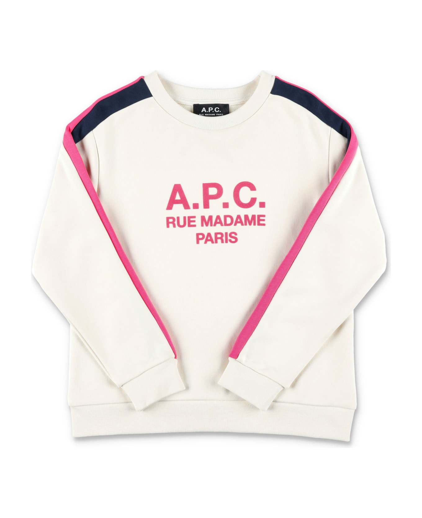 Cotton Jani Sweatshirt By A. p. c. Kids. Featuring: Crew Neck Contrast Stripes Along Each Sleeves "a. p. c. Rue Madame Paris" Logo Print At Front Rib Trims