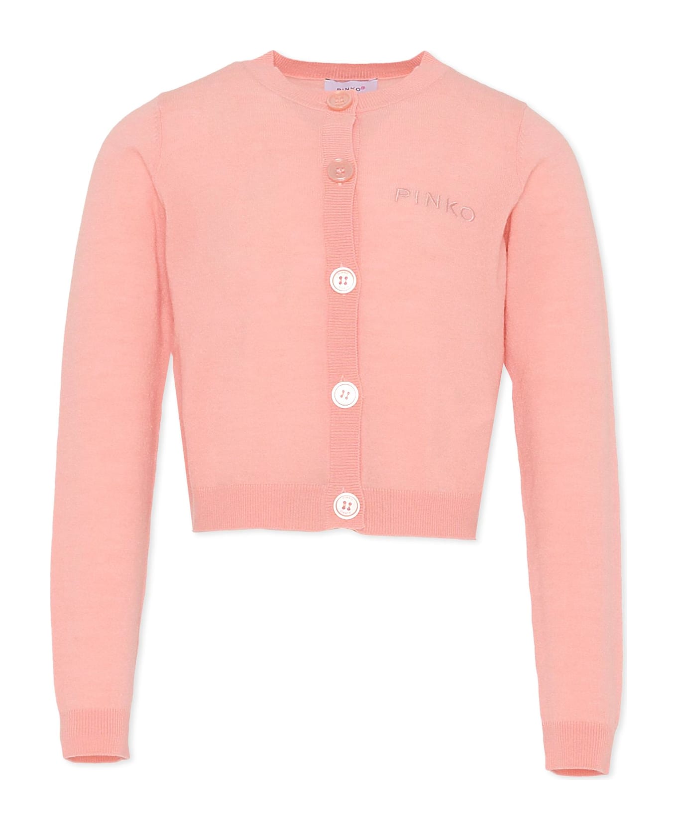 Pink long-sleeved cardigan with a ribbed crew neck, button front, and ribbed cuffs and hem. It is embellished with an embroidered logo on the chest.