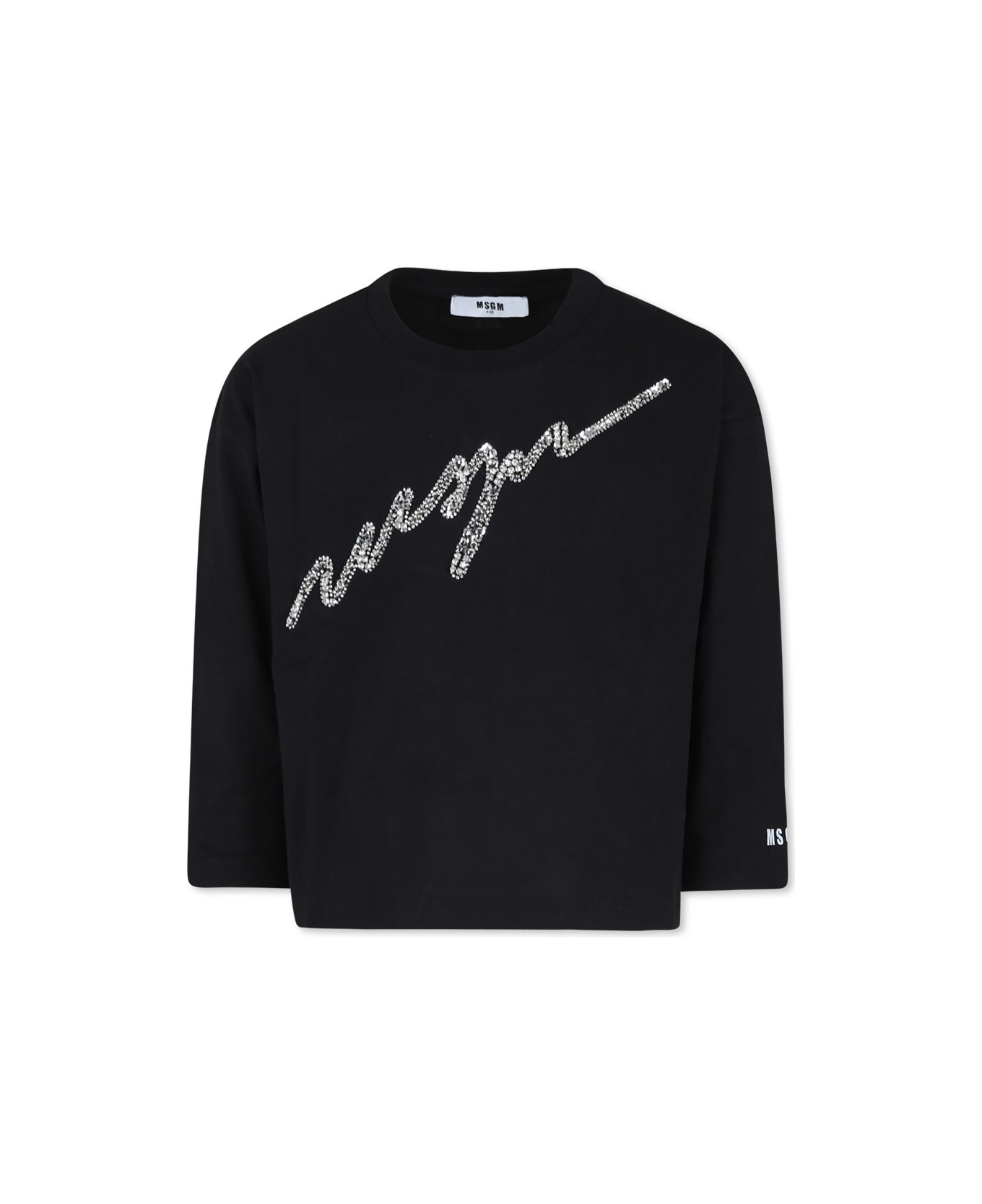 Black cotton t-shirt, long sleeves, with ribbed crew neck and asymmetric hem. It is embellished with front logo with rhinestones, sequins and beads, with logo printed on the sleeve.