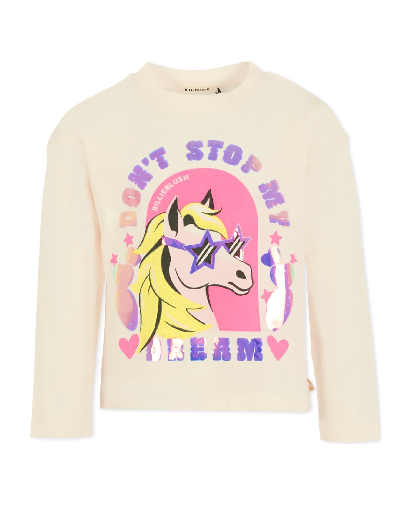 Ivory cotton t-shirt, with long sleeves and ribbed crew neck. It is embellished with a unicorn print on the front.