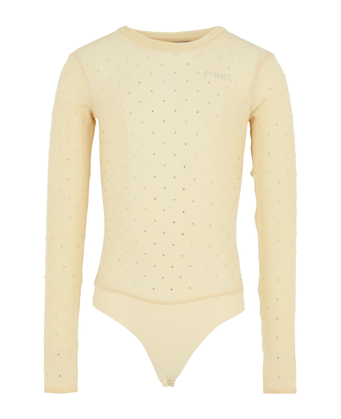 Pink mesh bodysuit with long sleeves, a crew neck, and snap buttons between the legs. It is embellished with all-over rhinestons and logo on the chest.