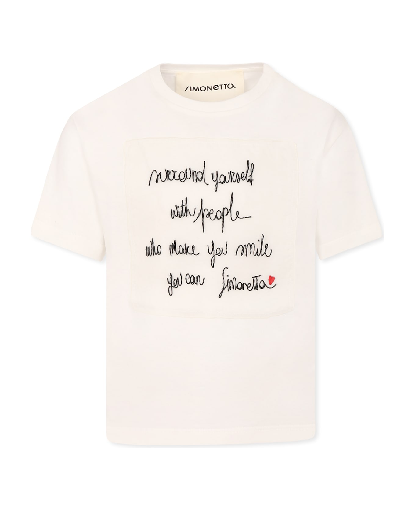 White cotton t-shirt, with short sleeves and ribbed crew neck. It is embellished with slogan and logo, embroidered on the front.