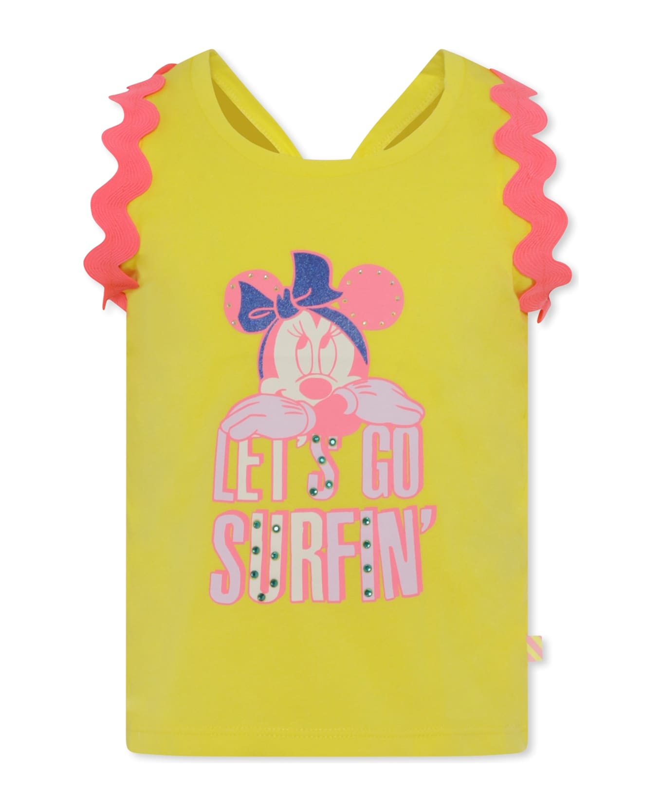 Yellow cotton tank top with scalloped detail and knot on the back. It is embellished with Minnie print and writing on the front. It is a Disney x Billlieblush collaboration.