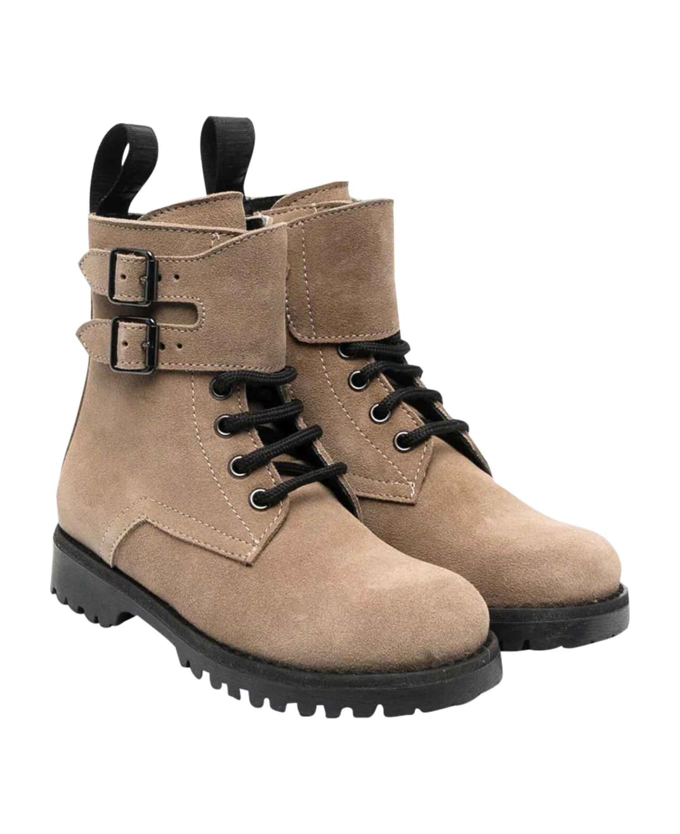 Beige boots unisex Boss Kids. Calfskin suede, double buckle closure, round toe, front closure with laces and chunky rubber sole. 100% Rubber sole