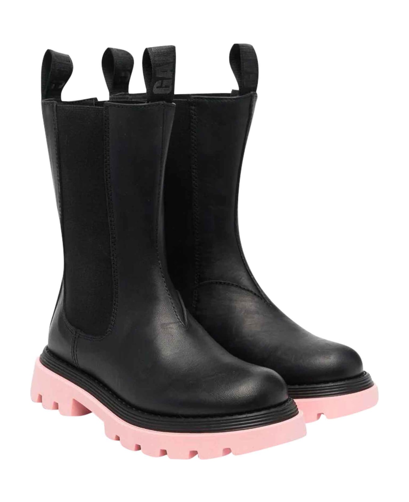Black boots girl Boss Kids with pink details. Round toe, side elastic panels, double tongue closure and chunky rubber sole. 100% Rubber sole