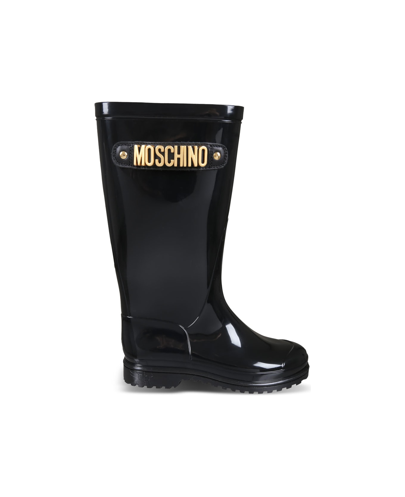 Black rain boots with rubber sole. They are embellished with metal logo on the sides.