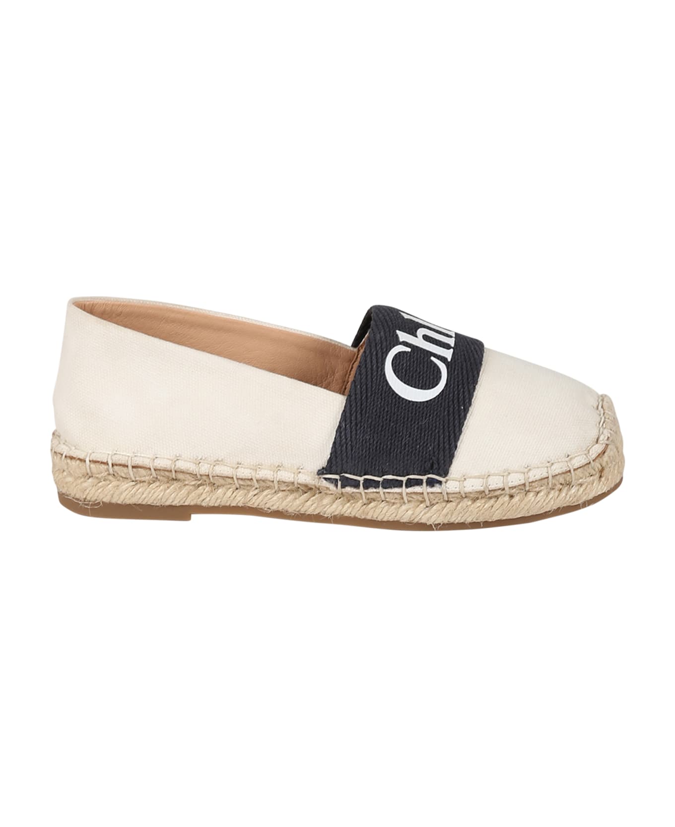 Ivory espadrilles, in canvas, with woven raffia sole, round toe. They are embellished with blue band and logo print on the top.