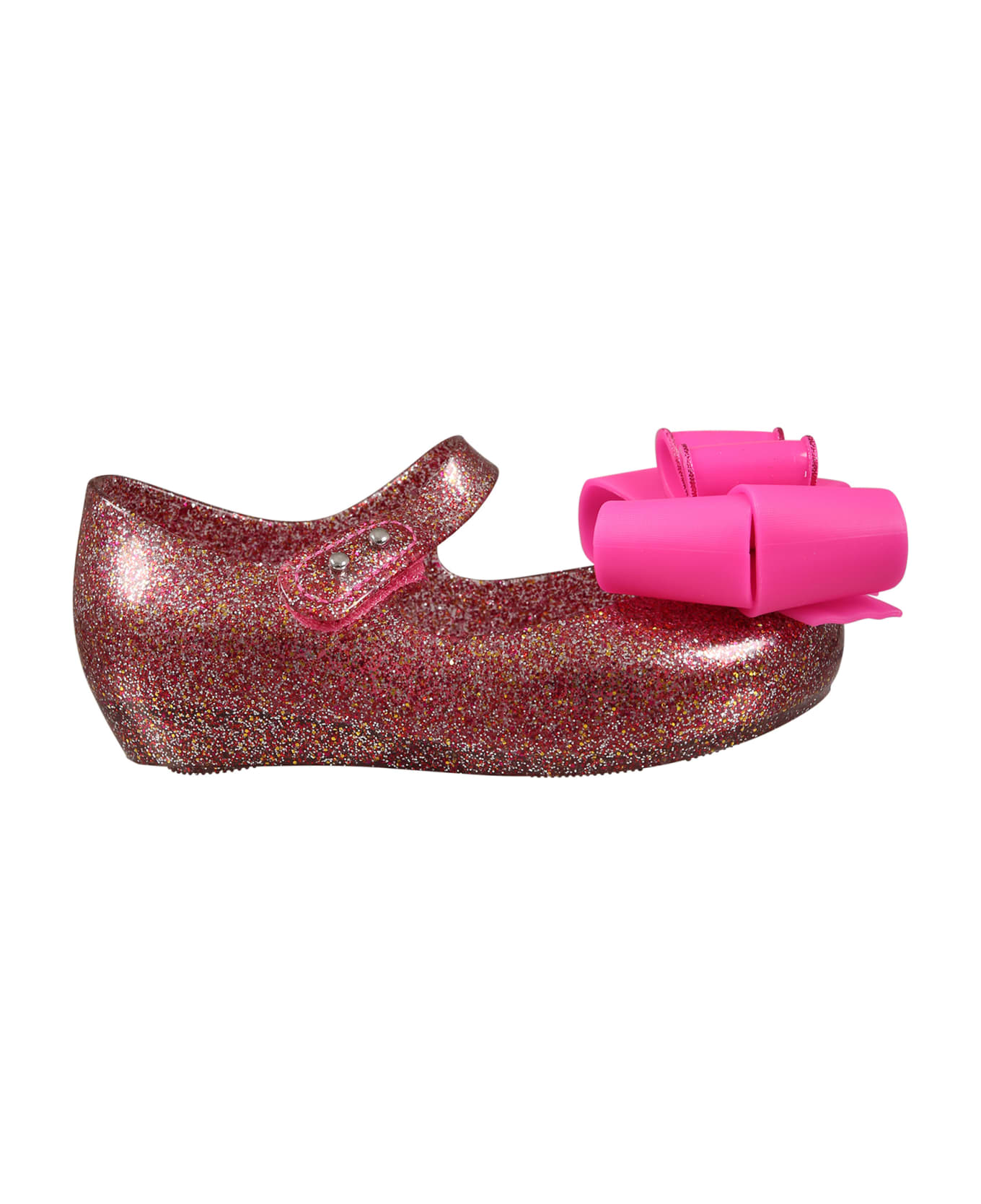 Multicolor scented ballet flats, with velcro closure, rubber sole and soft insole. They are embellished with all-over glitter and a fuchsia bow on the front.