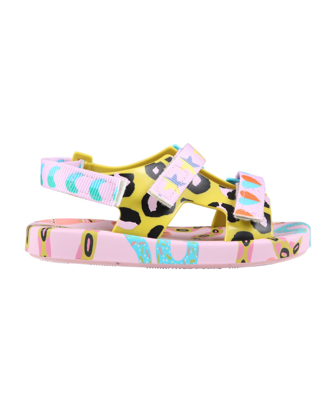 Multicolor scented sandals, with rubber sole, adjustable bands with Velcro on the front and Velcro closure, on the back. They are embellished with stars, hearts and animal print. They are made in collaboration with Fábula.