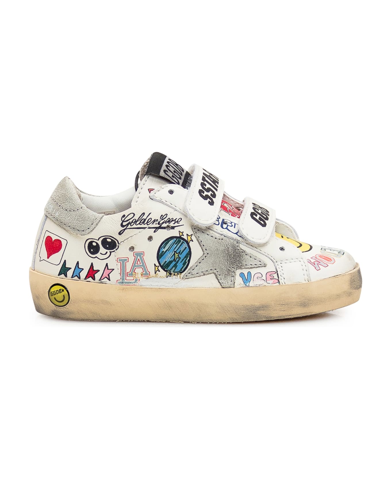 White sneakers with multicolor print. Closure with tear-off laces. Logo on the tongue and heel.