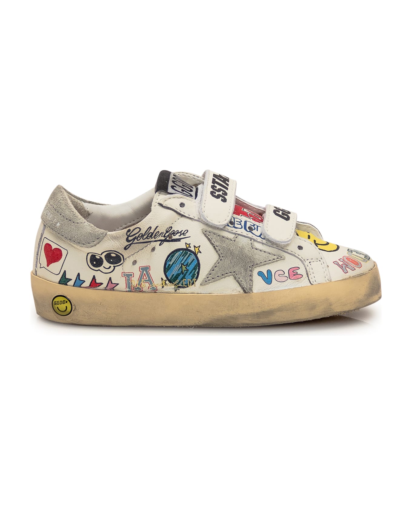 White low sneaker. Closure with rips. Star patch on the side. Contrast heel with logo. Lettering and all-over graphics.
