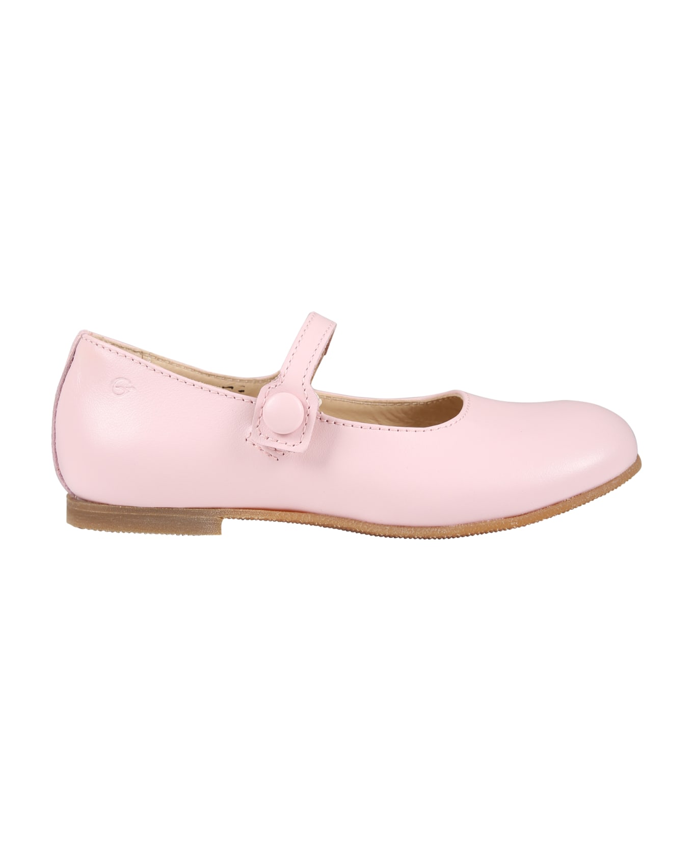Pink ballet flats in leather, with beige rubber sole and velcro closure on the top.