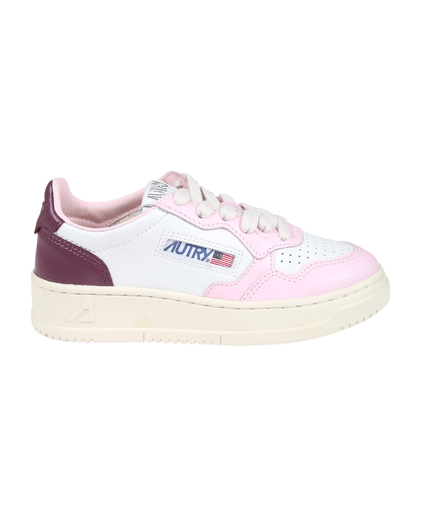 Pink and white sneakers with ivory oversized sole, lace-up closure on top, round toe, breathable holes and padded ankle. They are embellished with side blue logo, grey logo on the front and purple leather heel.