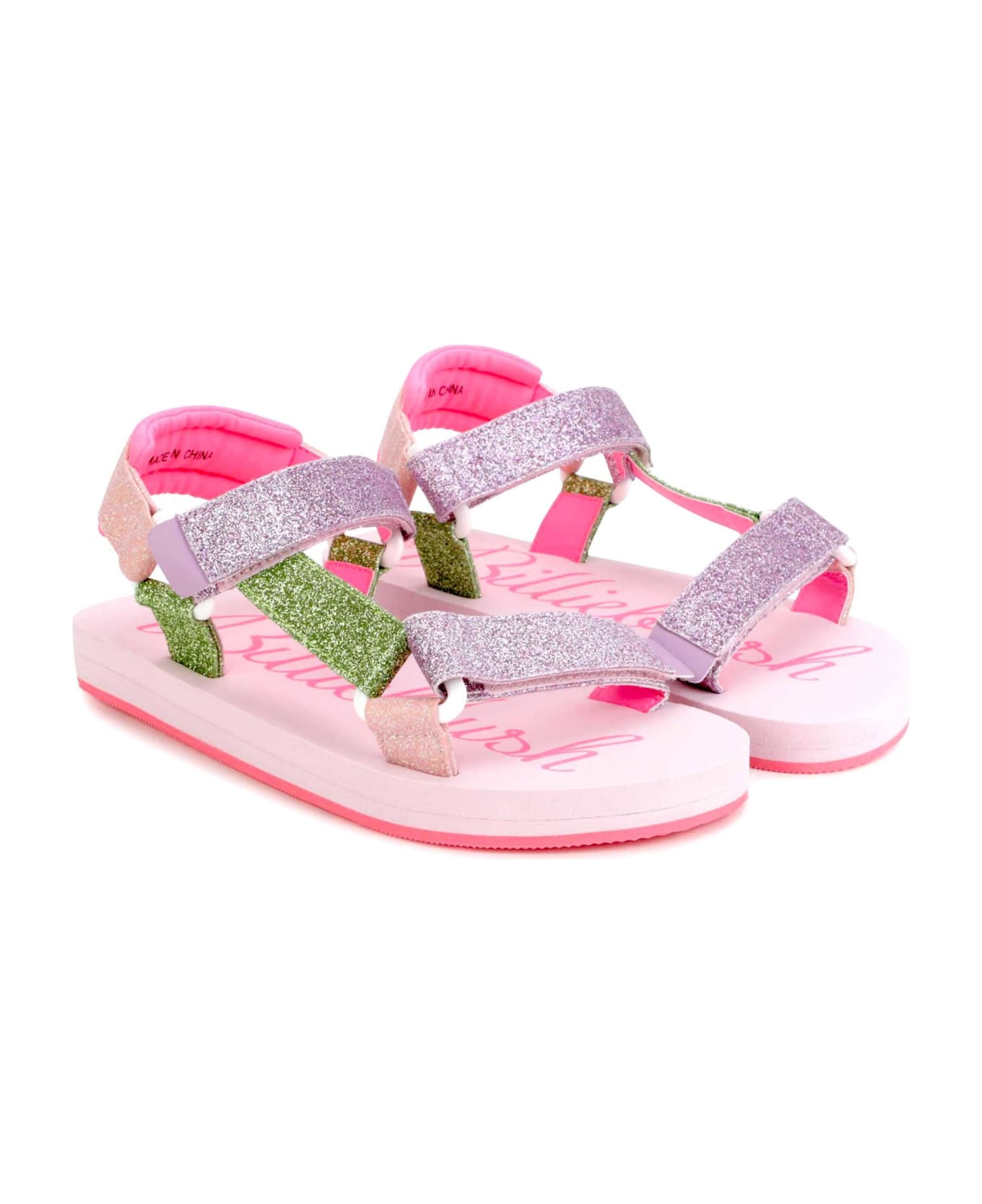 glitter-detail flat sandals from Billieblush featuring light pink, lilac, green, glitter detailing, colour-block design, logo-print strap, branded insole, open toe, front touch-strap fastening and flat rubber sole.