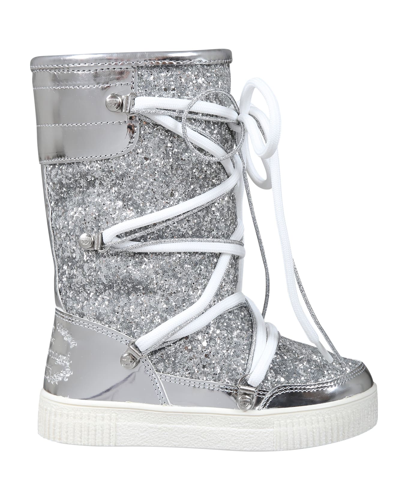 Silver lurex boots, with rubber sole, lace closure, round toe, shearling lining. Upper made of textile and other materials, upper lining and inner sole made of textile materials, outer sole made of other materials. They are embellished with logo on the back.