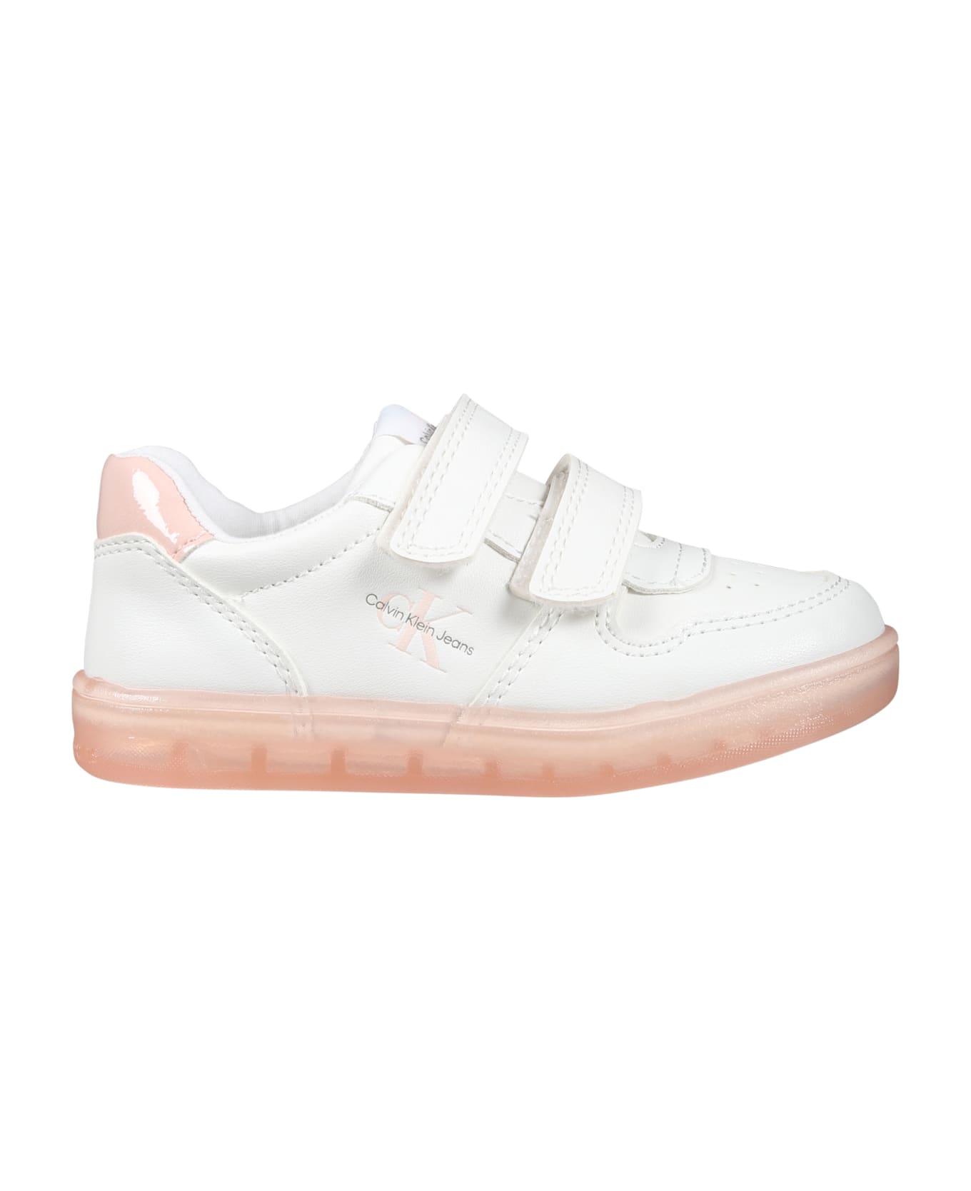 White sneakers in recycled polyester, pink rubber sole and double velcro closure. They are embellished with side logo and pink detail on the back.