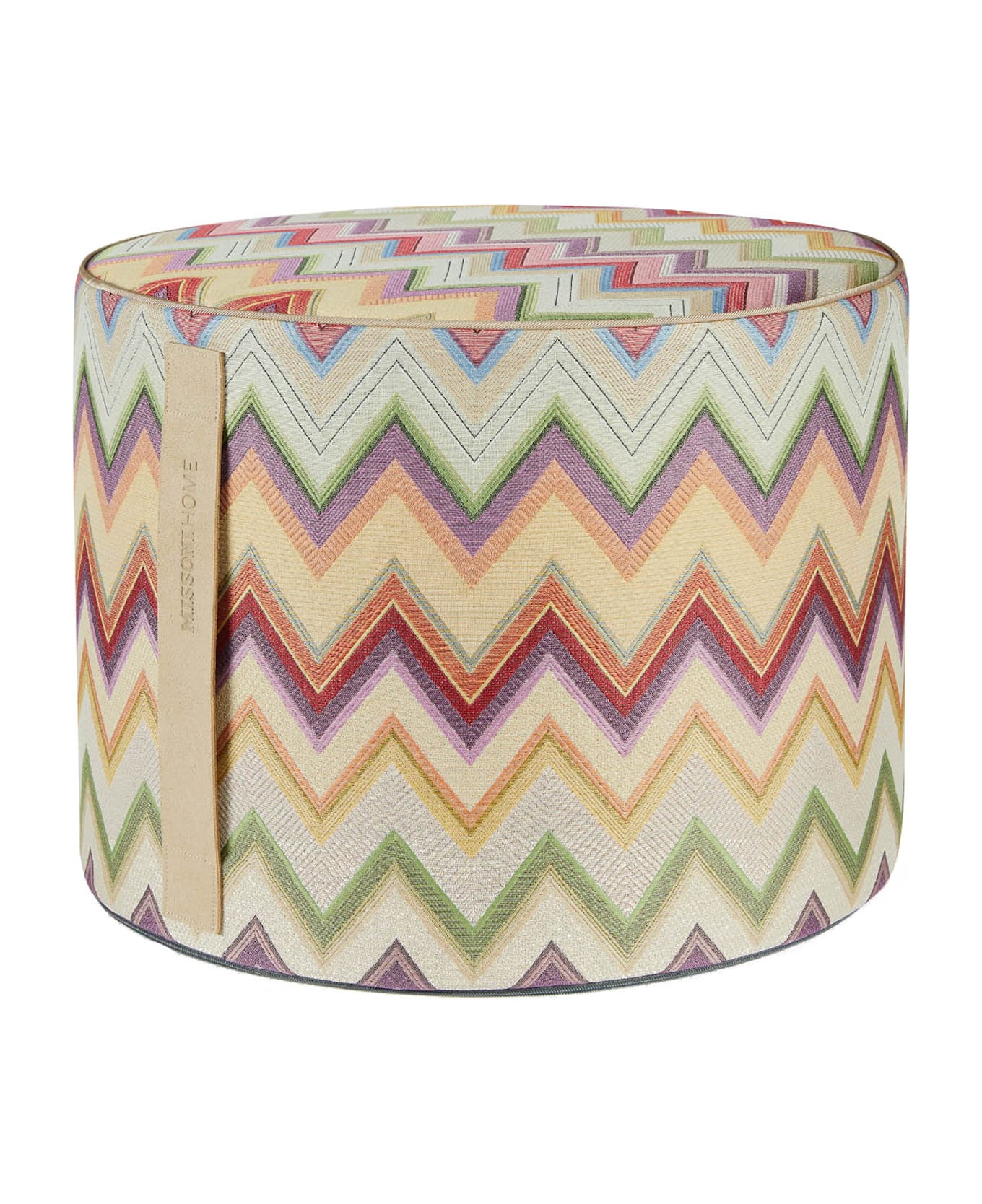 It stands out for a surface that is rather textural to the touch, enriched by the iconic maxi-chevron by which MissoniHome interprets the Agadir cylinder in a palette of delicate, almost subdued tones The cover in a cotton-blend jacquard fabric, with a zig-zag pattern in pastel shades and a suede handle is removable.