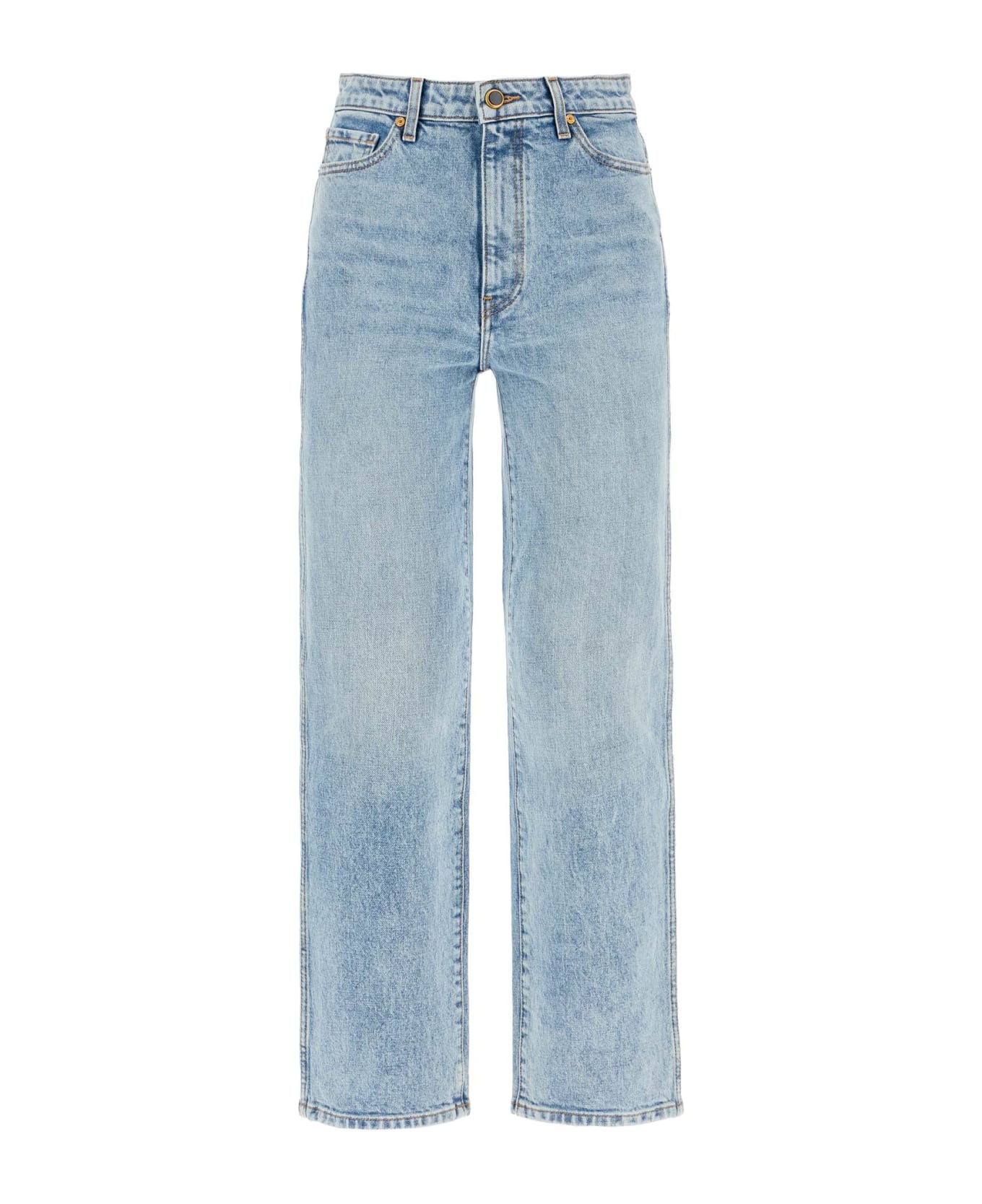 The Abigail jeans by Khaite are made of pure cotton denim with a light vintage wash. They feature a five-pocket design with a straight and regular fit, cropped cut. The front closure has an enamel button and hidden zipper, and there are belt loops at the waist. The model is 177 cm tall and wears a size 26.