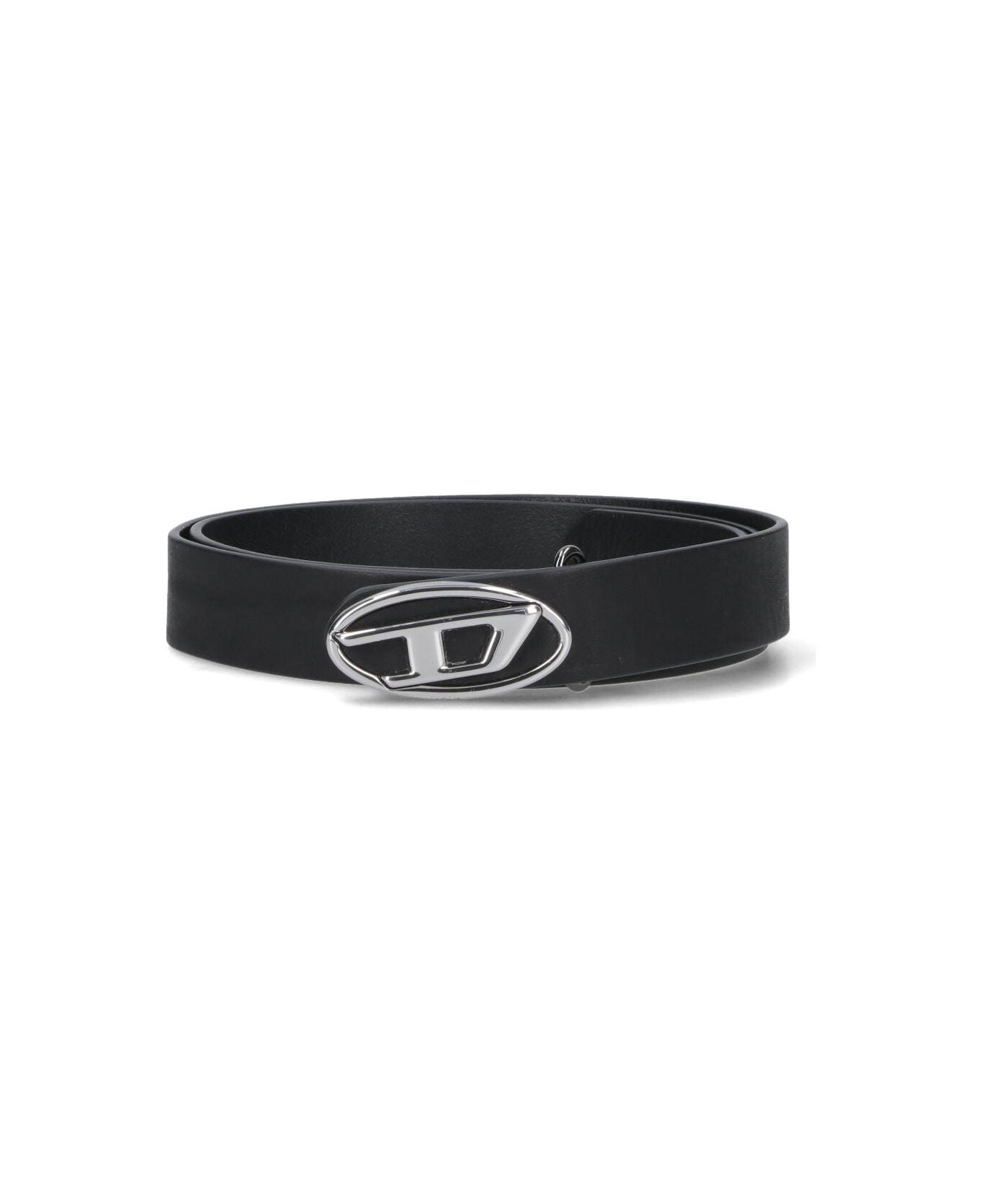 Adjustable B-1dr belt in black fabric, silver metal "oval D" logo buckle on the front.