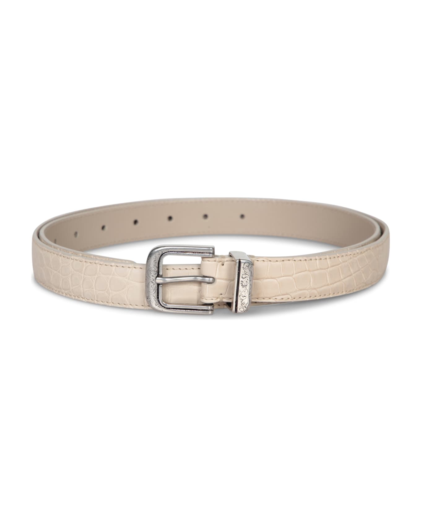 Timeless elegance with this Brunello Cucinelli beige alligator leather belt, finished with a distinctive crafted silver buckle for a touch of sophisticated refinement.