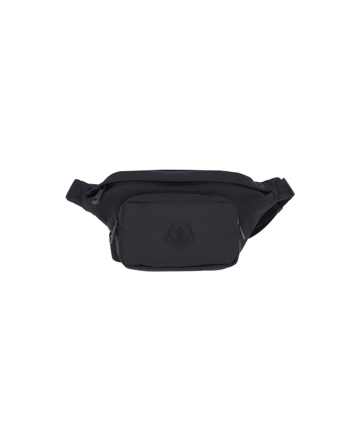Moncler 'Durance' waist bag in black nylon blend with tonal details, leather trims, water-repellent design, adjustable belt on the back, snap logo buckle closure, front zip pocket, silicone logo patch detail, back zip pocket, zip closure, single inner compartment.