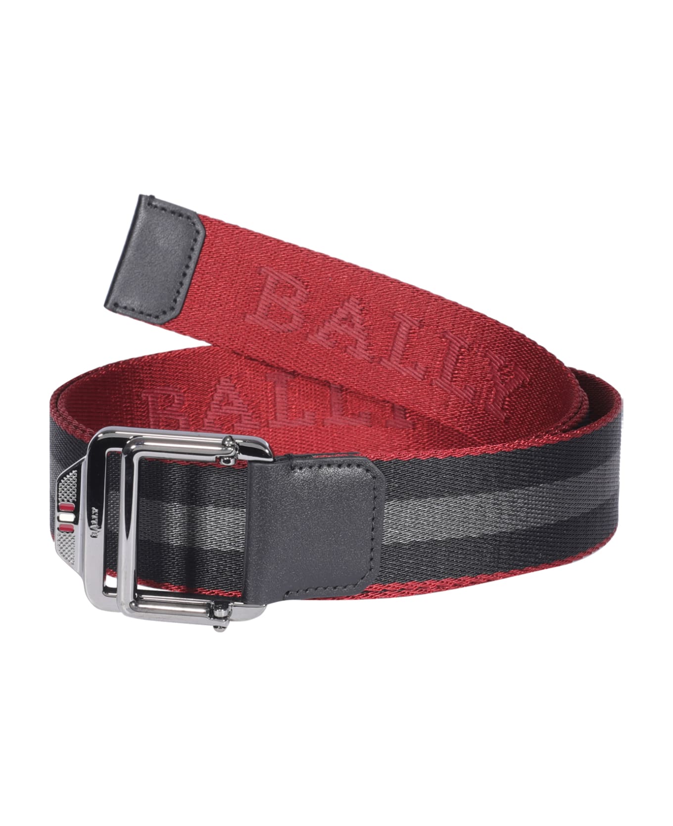 - man belt, buckle closure, logo, grey and red