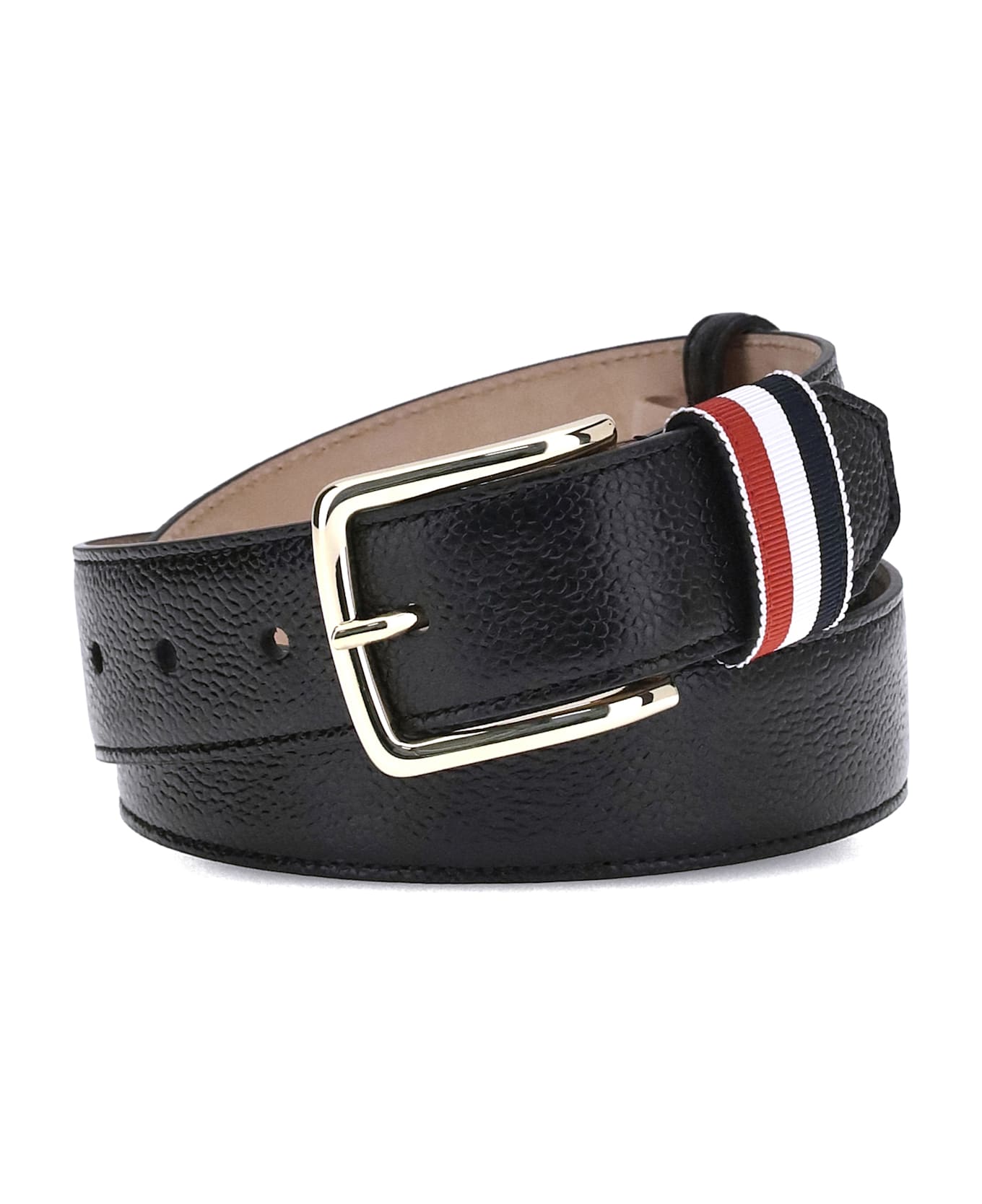 Thom browne's hammered leather belt combines craftsmanship and distinctive style. featuring a geometric buckle and classic detailing with the iconic tricolor bands, it lends a recognizable and refined touch to any look. width 3. 5 cm, ideal for versatile, everyday use.