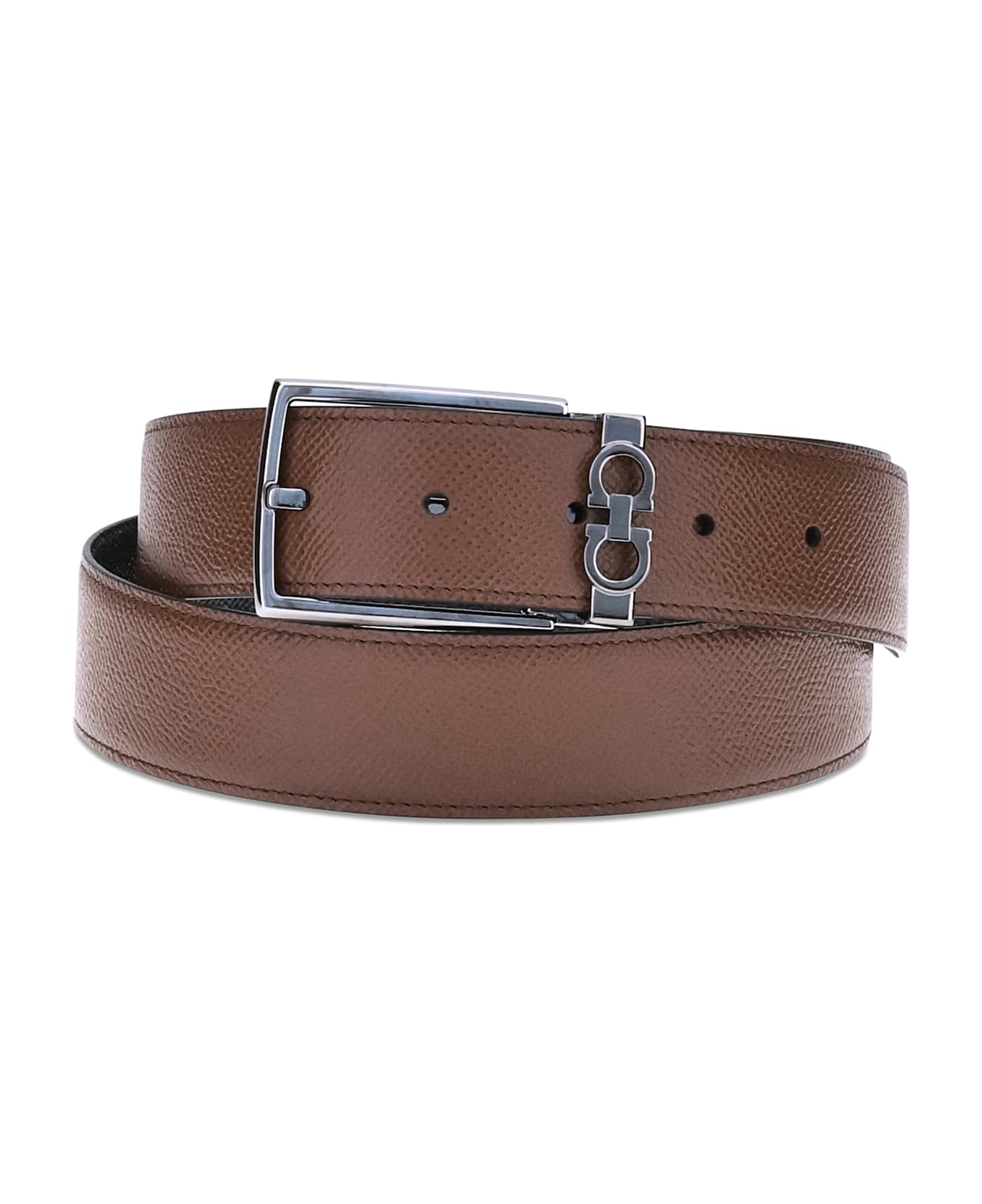 Ferragamo's reversible belt is a versatile and sophisticated accessory perfect for any occasion. made of grained leather, this belt features a stitched rod design that gives a more casual and contemporary look. the rectangular buckle, personalized with a small gancini on the loop, adds a distinctive and recognizable touch of the brand. reversible, it offers the possibility to easily combine different styles and colors, making it a practical and classy accessory.