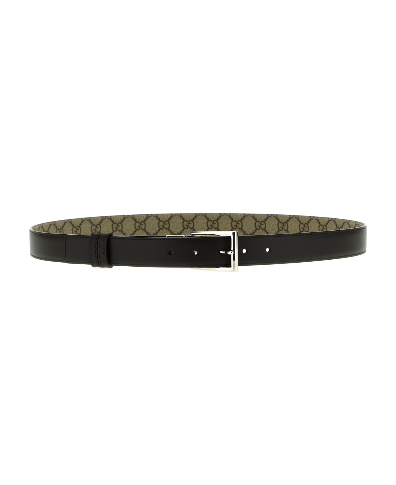 Reversible leather belt with all-over logo side and rectangular metal buckle. Composition: