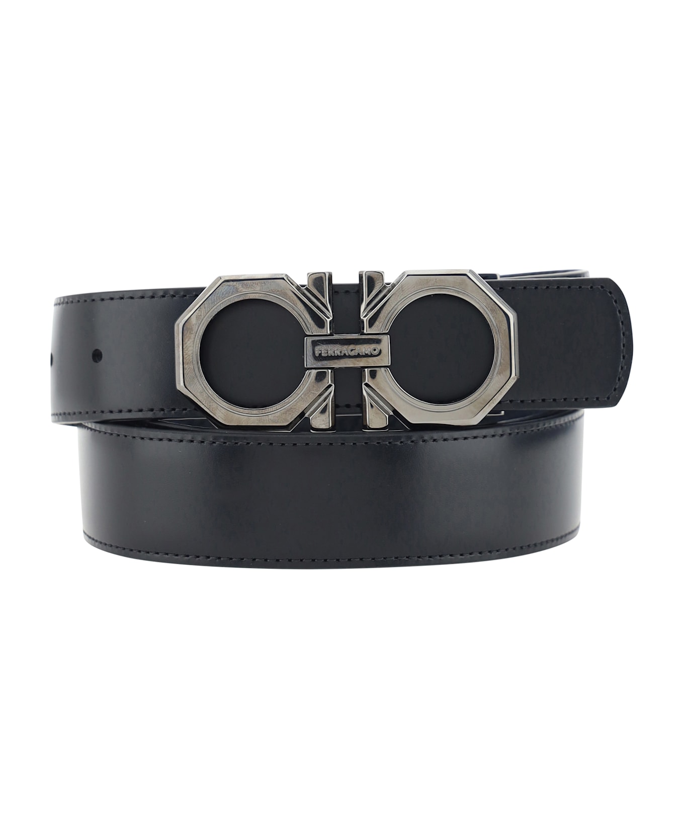 Ferragamo's reversible leather belt features a double-face design that allows you to choose between two different looks. the metal buckle is embellished with the brand's iconic gancini logo, with the ferragamo signature engraved for an elegant and distinctive detail. the 3 cm thickness makes it perfect for completing any outfit with class, from casual to formal. Composition: 100% % Calf Leather Bos Taurus