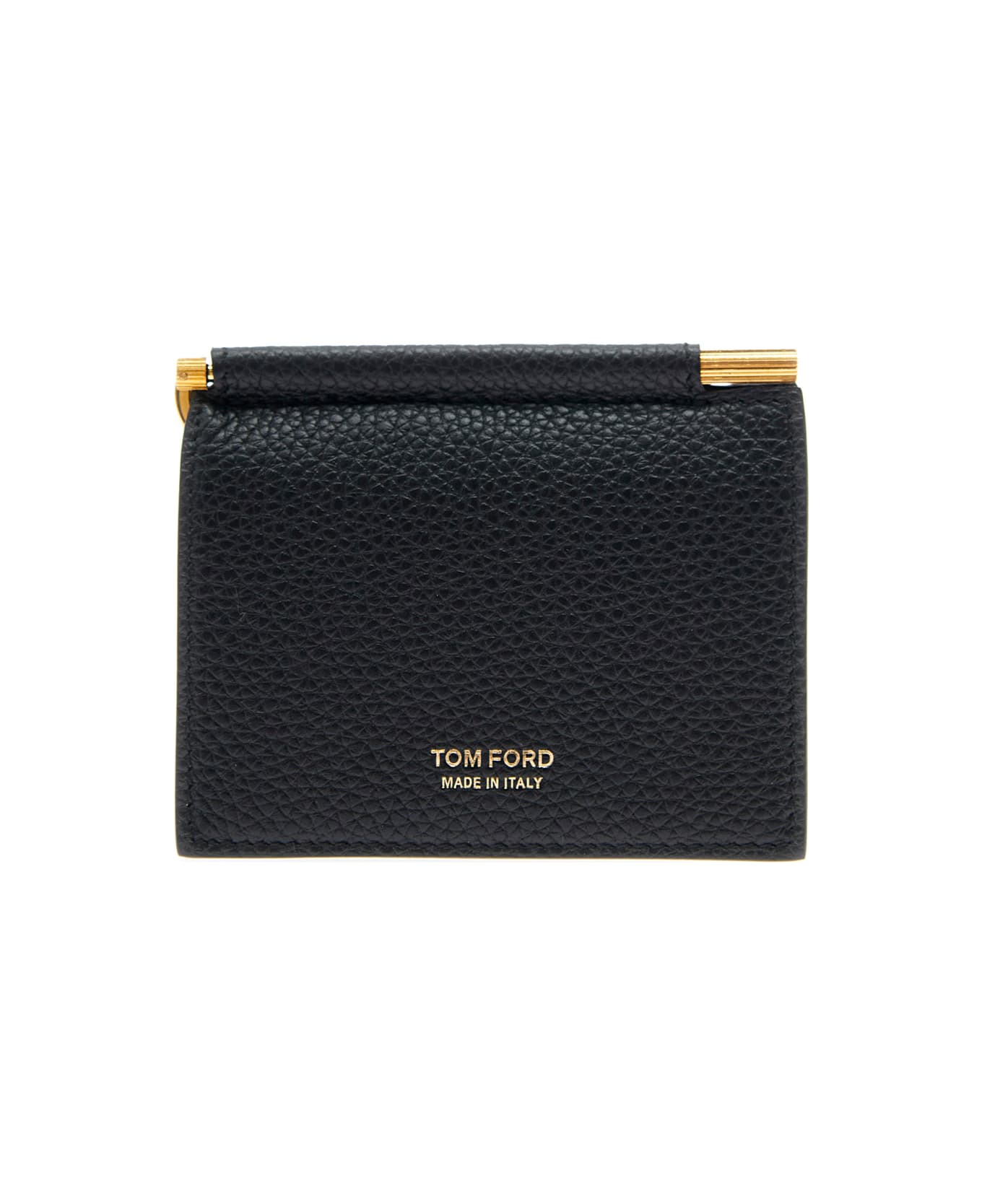 Bi-fold wallet Black Embossed logo lettering on the front Eight card slots on the inside Gold tone money clip on the side Embossed logo lettering on the inside Gold tone metalware Grained leather Dimensions: 11x9 cm