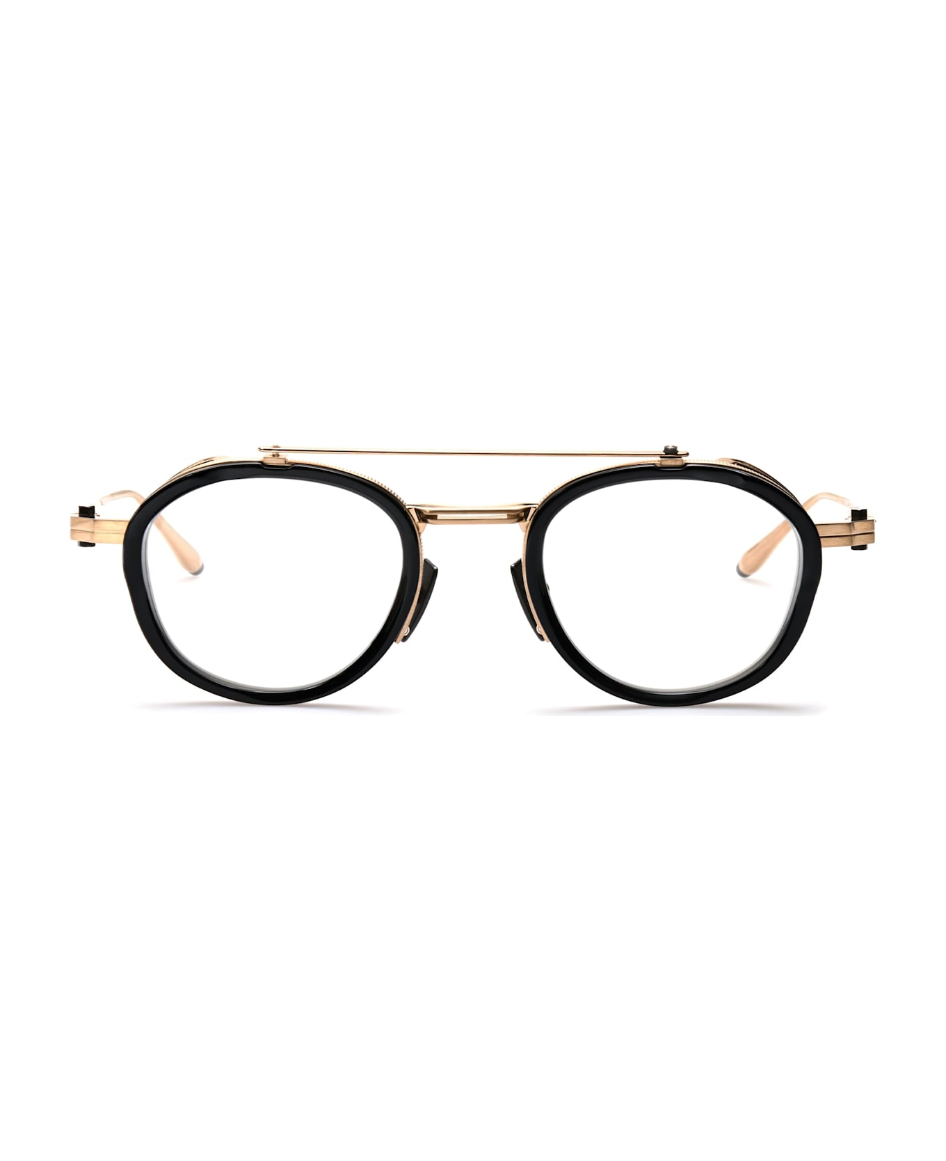 Akoni INFINITY - BLACK / BRUSHED 12K GOLD RX (AKX-512A-46) are round sunglasses with a '90s-inspired silhouette, made in Japan. They feature a bold Japanese acetate front with a Japanese titanium structure, brow bar, titanium perforated side shields, titanium temples with acetate tips and dark grey lens with 100% UV protection.