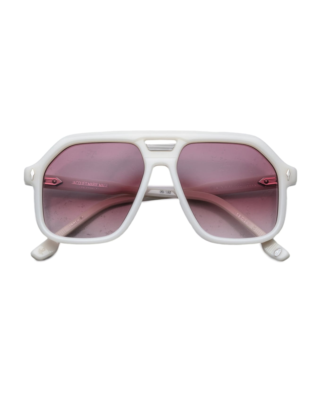 Jacques Marie Mage CASIUS - LOTUS (JMMCU-8X) are boxy mid-size navigator sunglasses made in Japan. They feature white 10mm cured cellulose acetate frame, custom double laminated acetate temples with precious metal hardware, double brow bridge with titanium embellishment, silver signature front pins, hidden wirecore, tension-secured custom 5 barrel hinge, merlot 4 base CR39 lens with backside anti-reflective treatment and 100% UV protection.