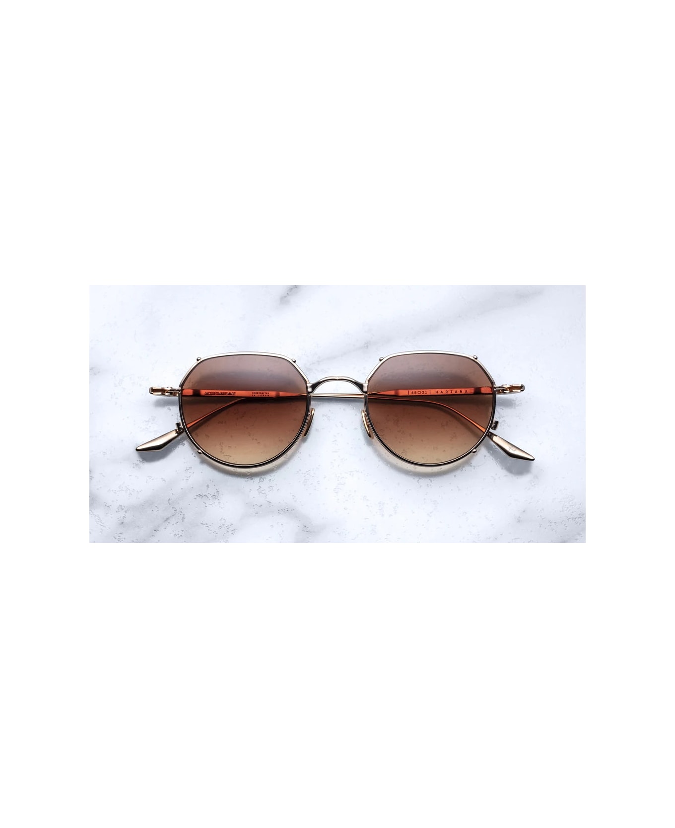 New addition to Jacques Marie Mage's Titanium Series, the Hartana - Altan are elegant and impeccably constructed sunglasses. Their lightweight panto-shaped design feature a double layered lens rim that creates a clip-on effect, custom hidden hinge, custom titanium nose pads with logo and engraved decorations, 4 base lenses with anti-reflective treatment and 100% UV protection.