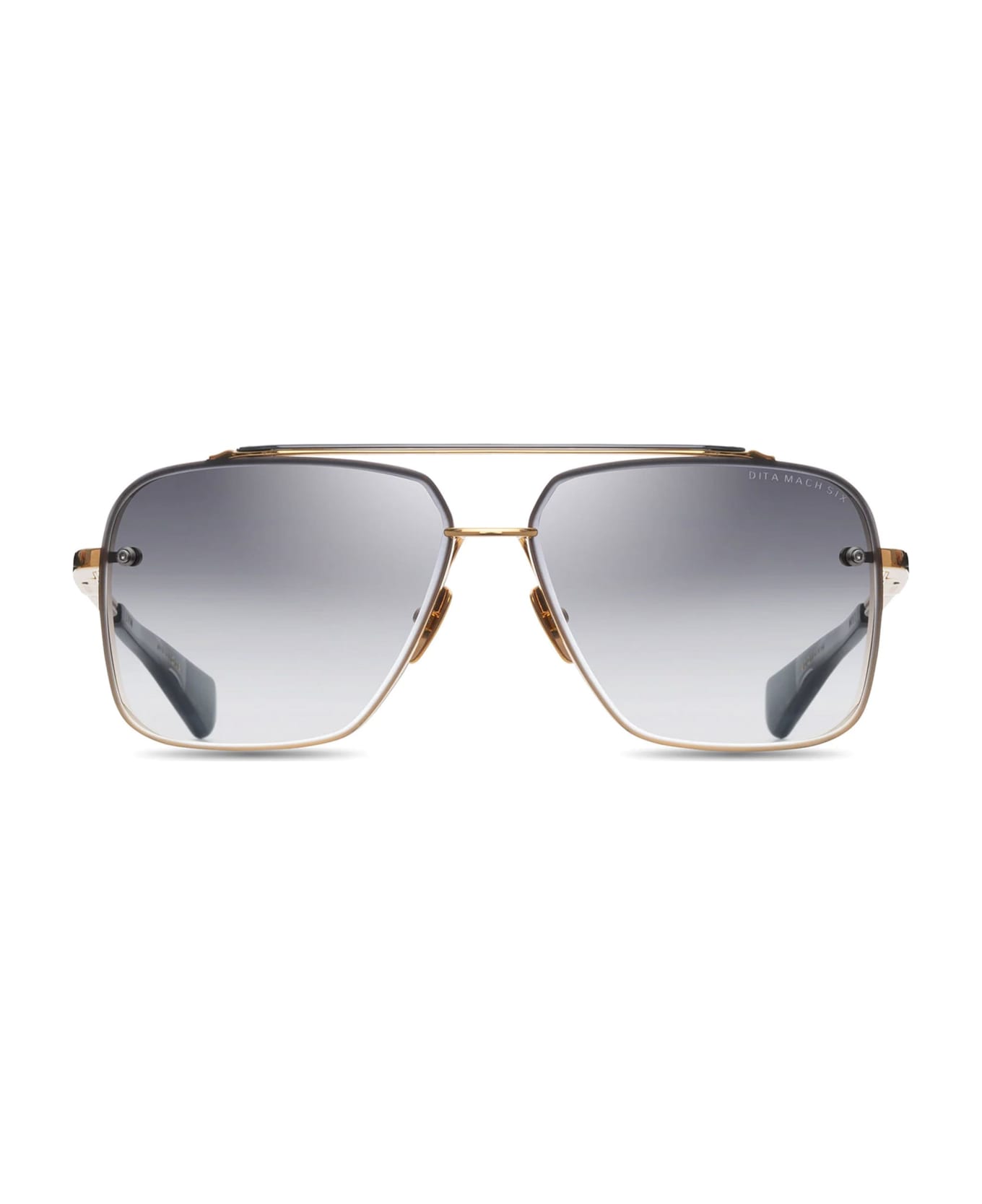 DITA MACH-SIX - YELLOW GOLD / BLACK RHODIUM (DTS121-62-01) are aviator sunglasses made in Japan, part of the Mach Series, inspired by the racing and automotive design. They feature gold titanium frame, forked temple hinge with Dita's hex screws to secure the temple to the frame's chassis, dual-titanium brown bar, custom nose pads, acetate temple tips with laser lined pattern, and gradient grey lens with 100% UV protection with anti-reflective coating.