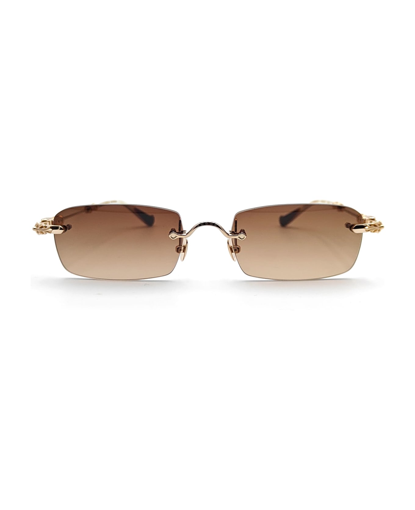 Chrome Hearts PILLS III - GOLD PLATED (323159700040E55G18) are rectangular rimless sunglasses, part of the exclusive Chrome Hearts luxury eyewear collection. They feature gold titanium frame with acetate temple tips, custom hinge, Chrome Hearts' 925 gold-plated silver floral cross emblem decorations, and gradient brown lens with 100% UV protection.