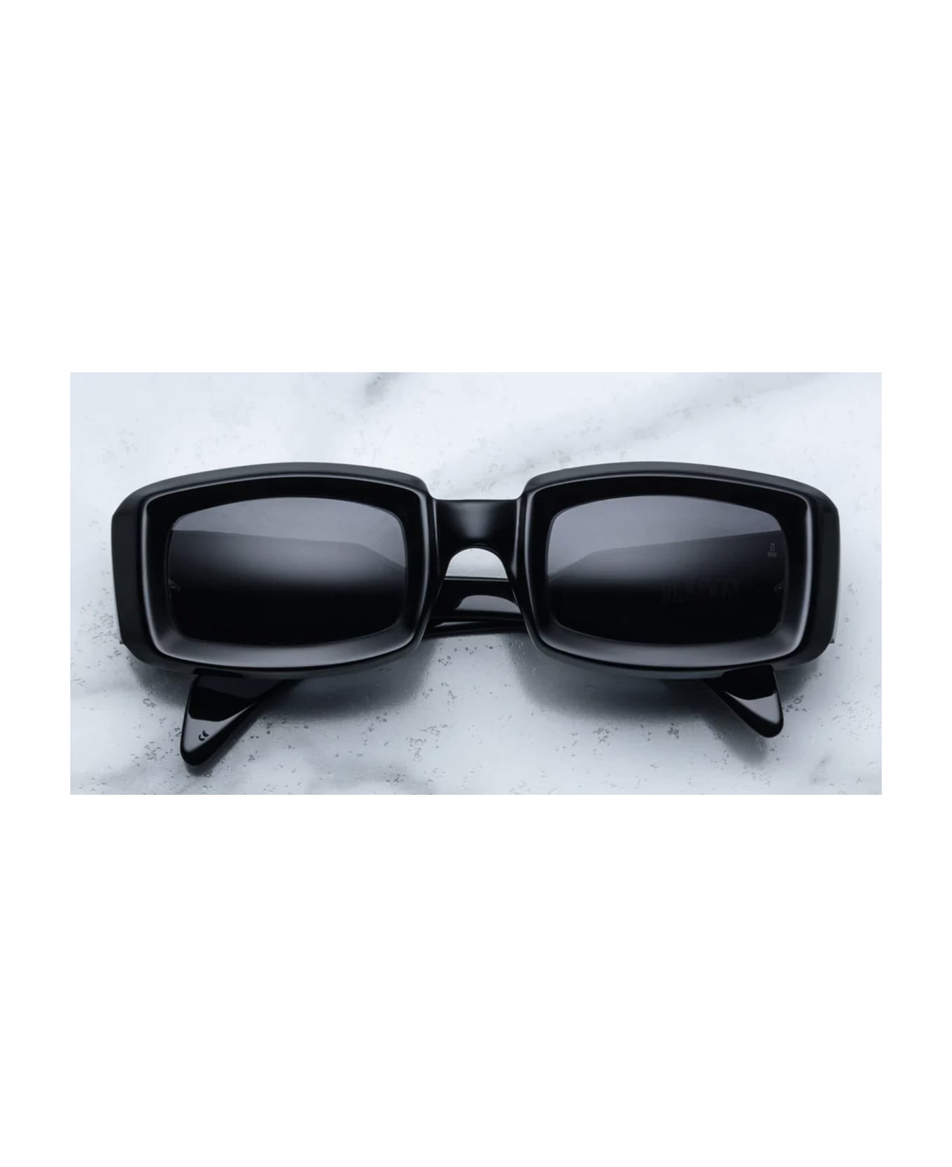 Jacques Marie Mage RUNAWAY - BLACK (JMMRU-88) are rectangular sunglasses made in Japan, inspired by the 70's. They feature 8mm acetate frame with custom acetate temples and precious metal hardware, dark gold wire core, tension-secured custom 7 barrel hinge with spur-shaped rivets, 6 base CR39 lens with backside anti-reflective treatment with 100% UV protection.