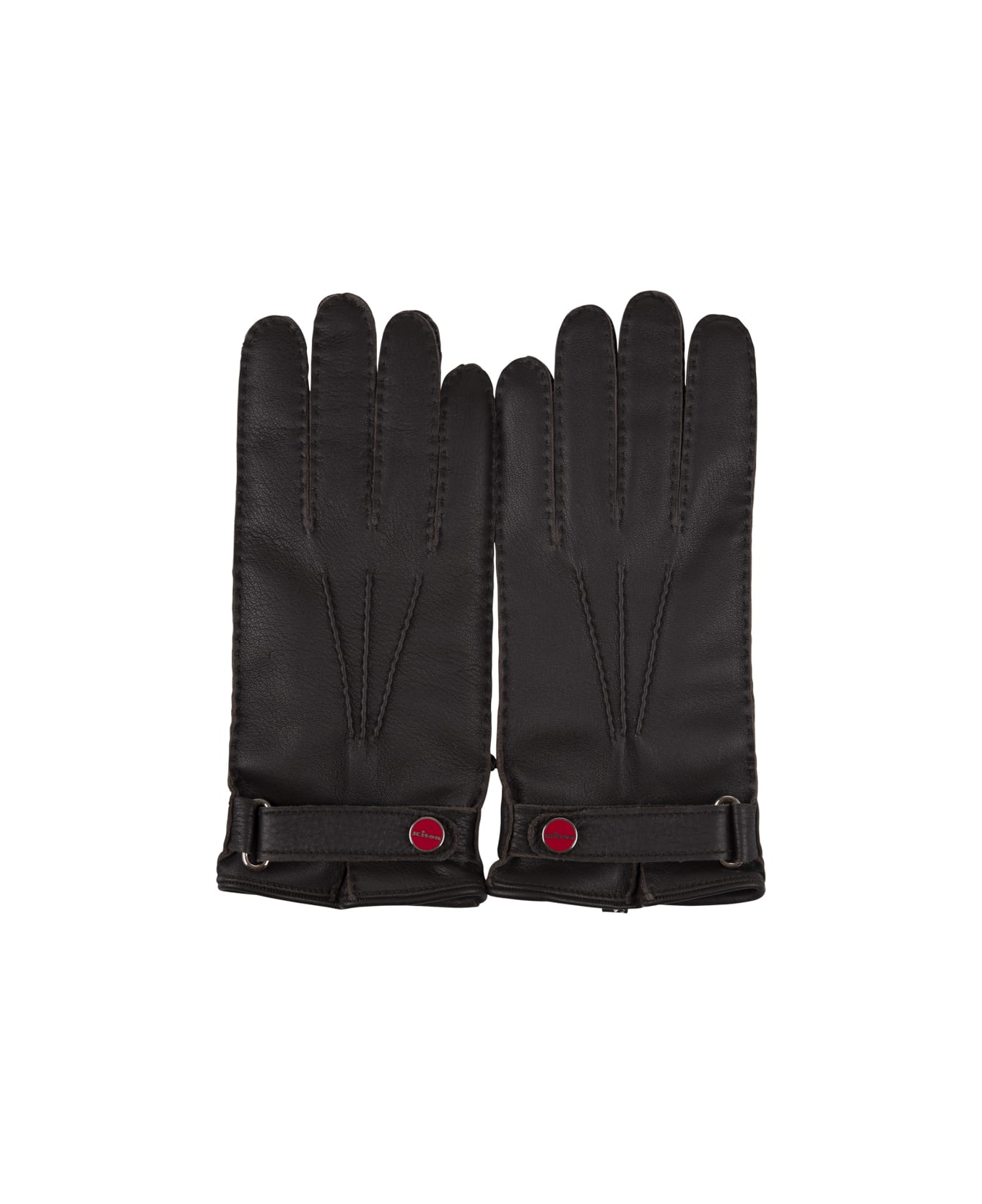 Kiton gloves for men made of dark brown leather and lined with fine cashmere. Model with tone-on-tone stitching and closure with zip and strap with red logoed button. Composition: Materials: 100% Leather, 100% Cashmere.