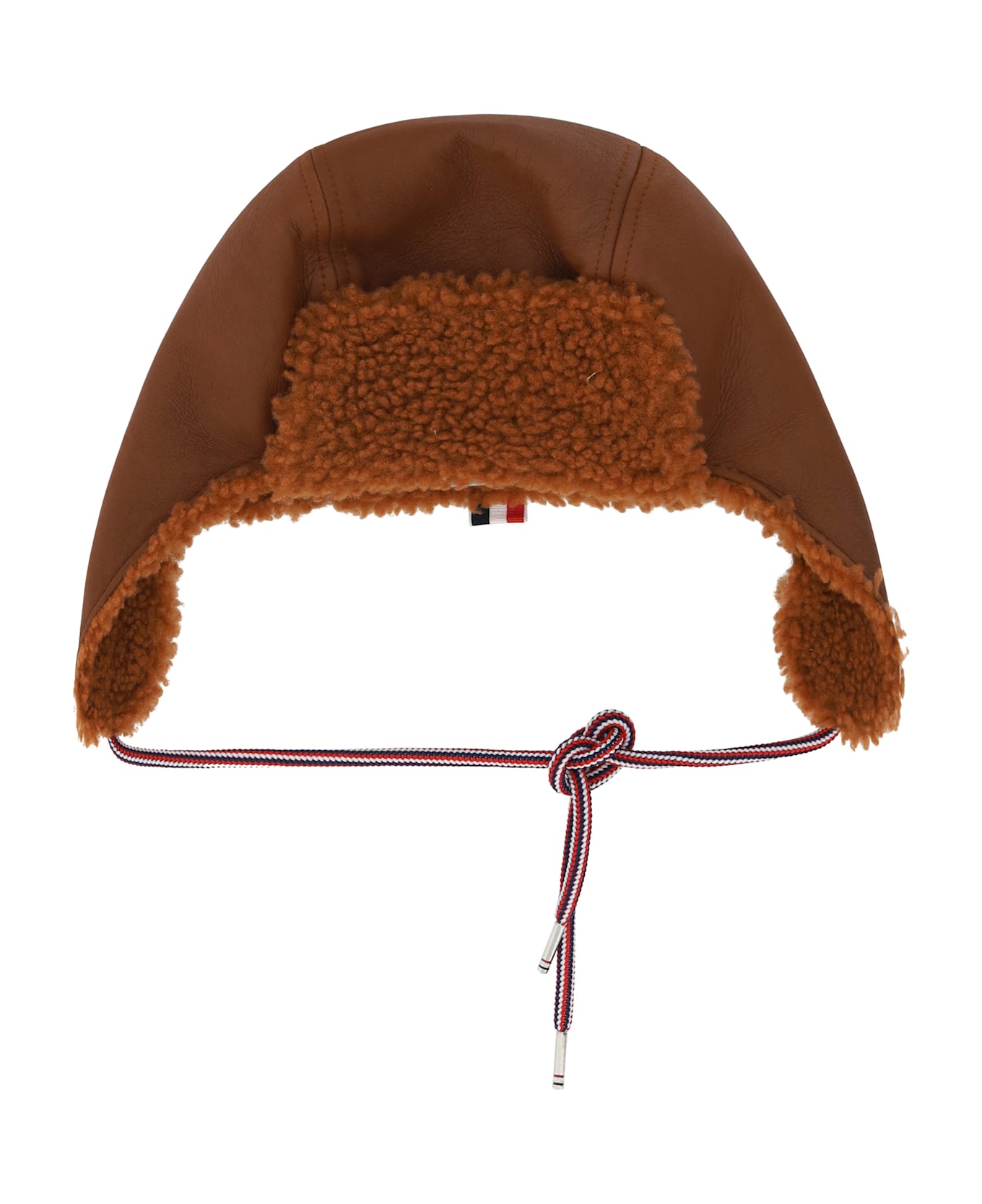Leather aviator hat by thom browne, soft shearling design in inner panel, under-chin closure by drawstrings with iconic brand colors, fabric detail with iconic brand colored bands, patch with iconic brand monogram on side panel.