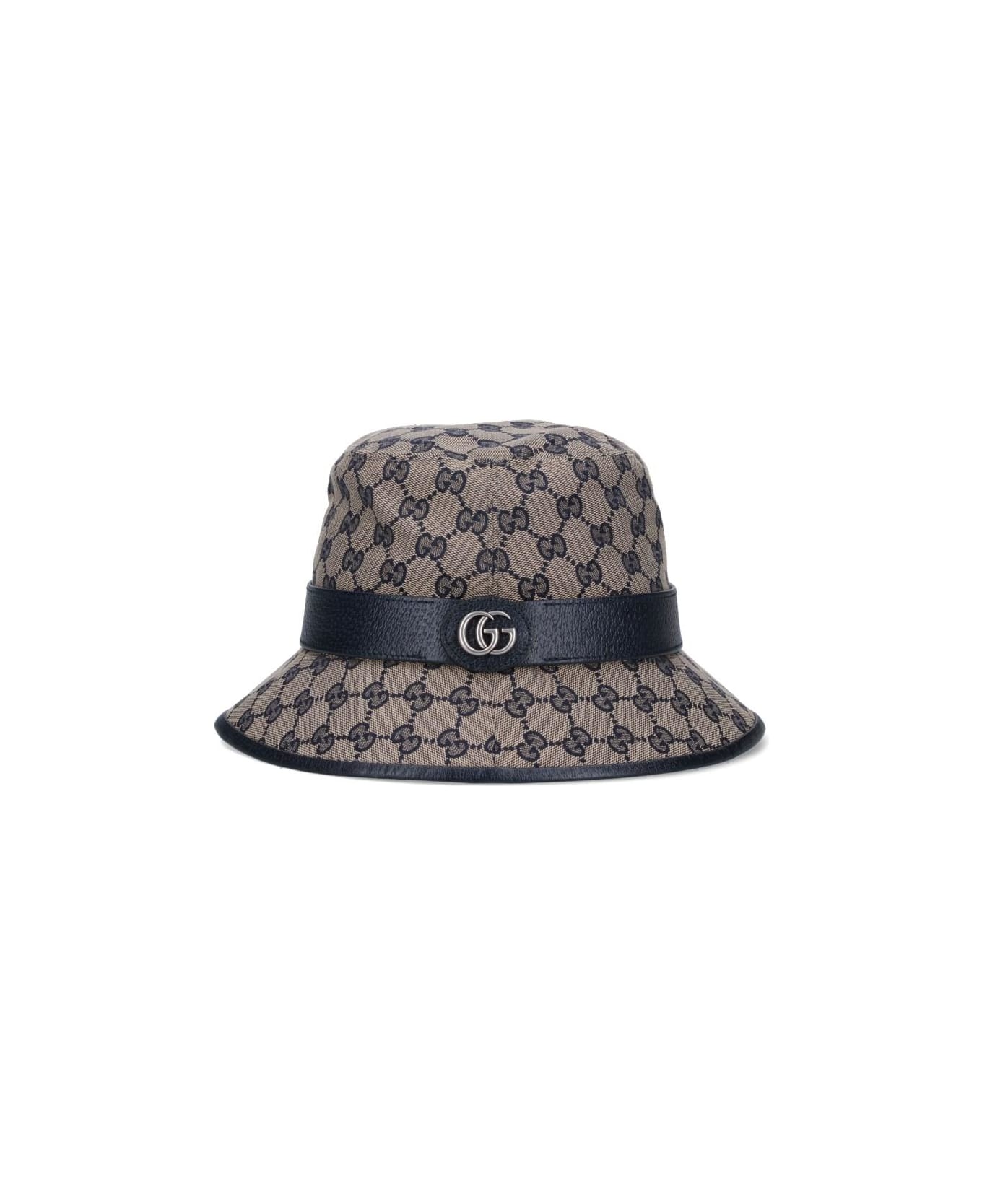 Gucci 'Cloche' hat in beige fabric with all-over 'GG' monogram pattern, blue leather band with silver metal logo patch detail on the front, and blue leather trim.