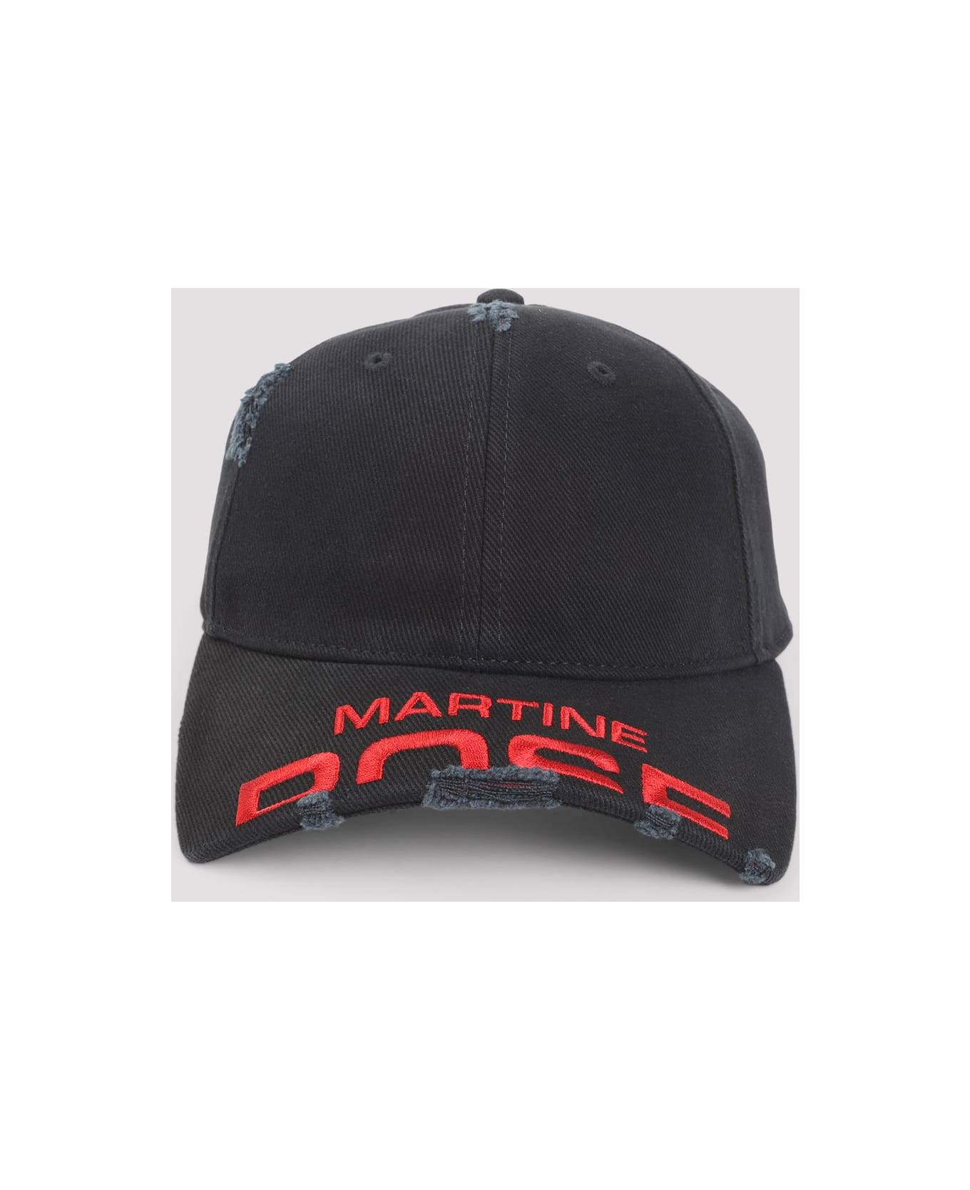 Martine Rose Black Washed Cotton Cut Peak Cap. Pure black washed cotton cap, six panel construction, contrasting red embroidered lettering logo on the visor, back adjustable strap, tonal stitching, overused design.