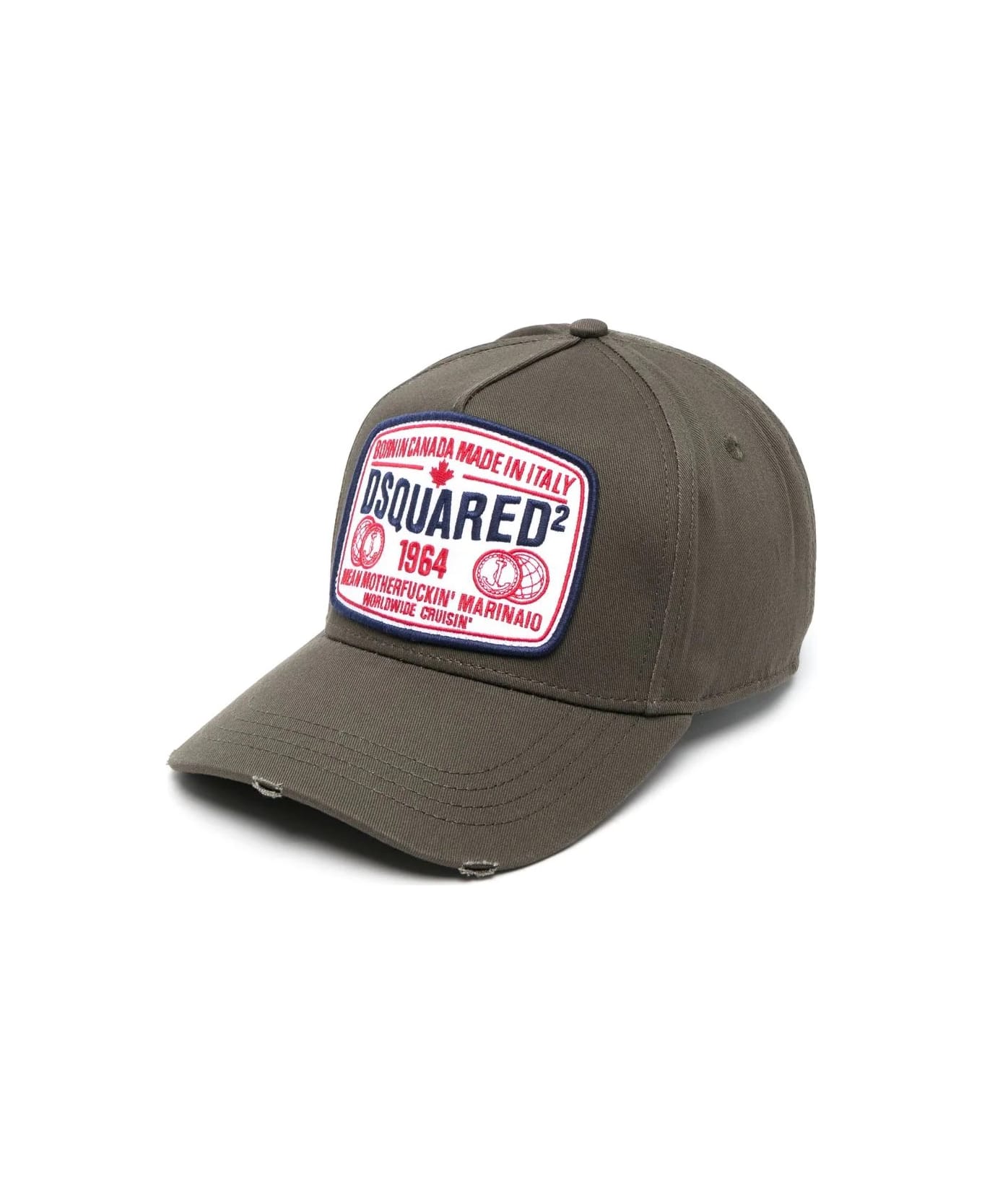 Dsquared2 baseball cap made of military green cotton gabardine with used effect and decorated with Dsquared2 1964 patch and contrasting 'Dean&Dan' embroidery on the back. Adjustable fit with back strap.