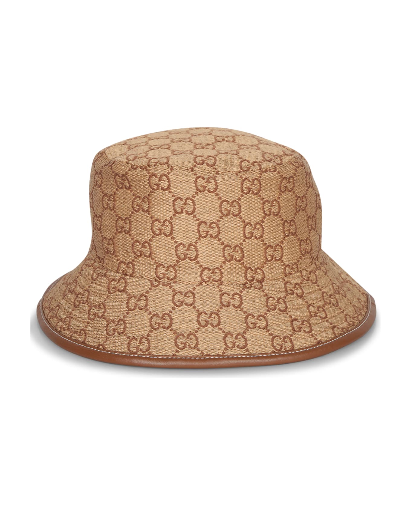 Exclusive Gucci Ginevra-style bucket hat crafted in orange beige jacquard fabric adorned with the iconic GG pattern. Elegant brown leather trim along the brim adds a sophisticated touch.