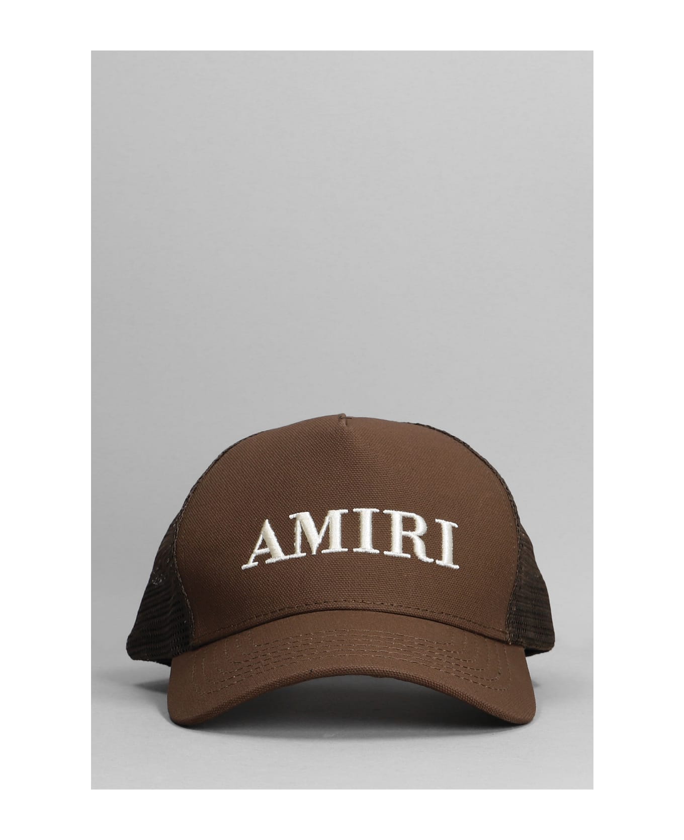 Hats in brown cotton, curved peak, adjustable belt, perfored side, front logo, Made in Usa