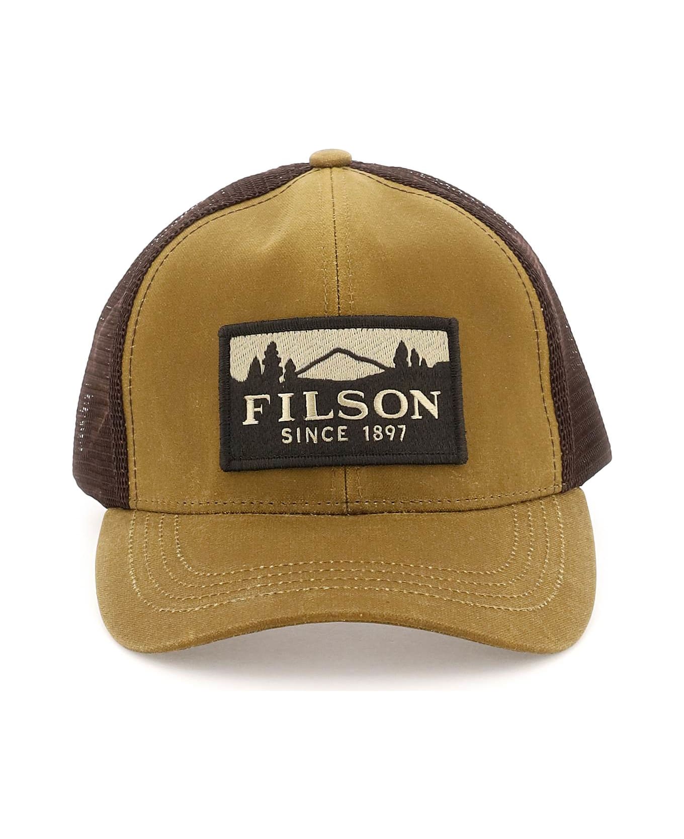 Filson trucker cap crafted in cotton canvas with mesh back, featuring front logo patch. Rear adjustable strap with antique gold-finished metal buckle with engraved logo. Unlined.