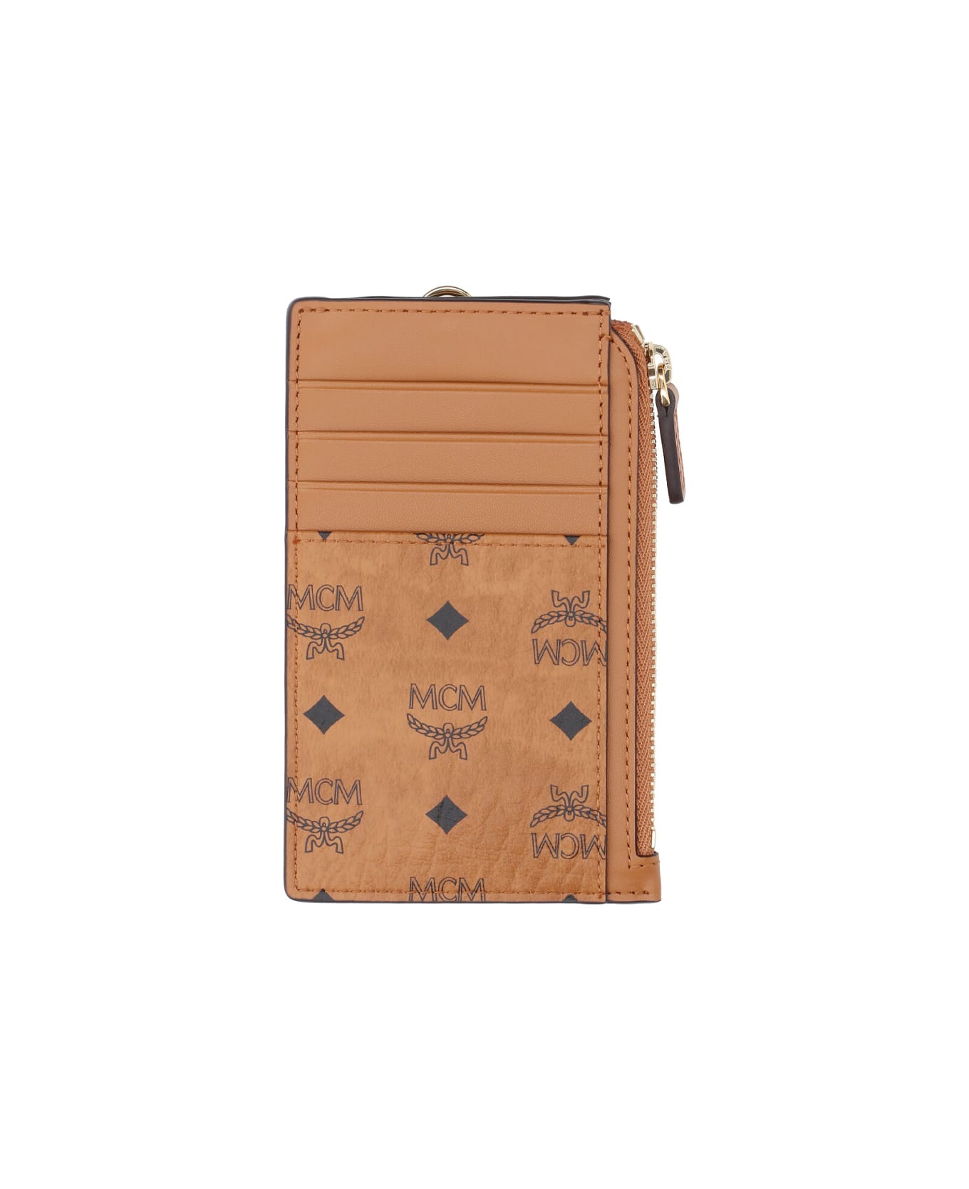 MCM 'lanyard' card holder in brown visetos eco-leather, all-over logo pattern, top shoulder strap, one zip pocket, four card slots. Composition: 63% Polyurethane, 20% Polyester, 17% Cotton