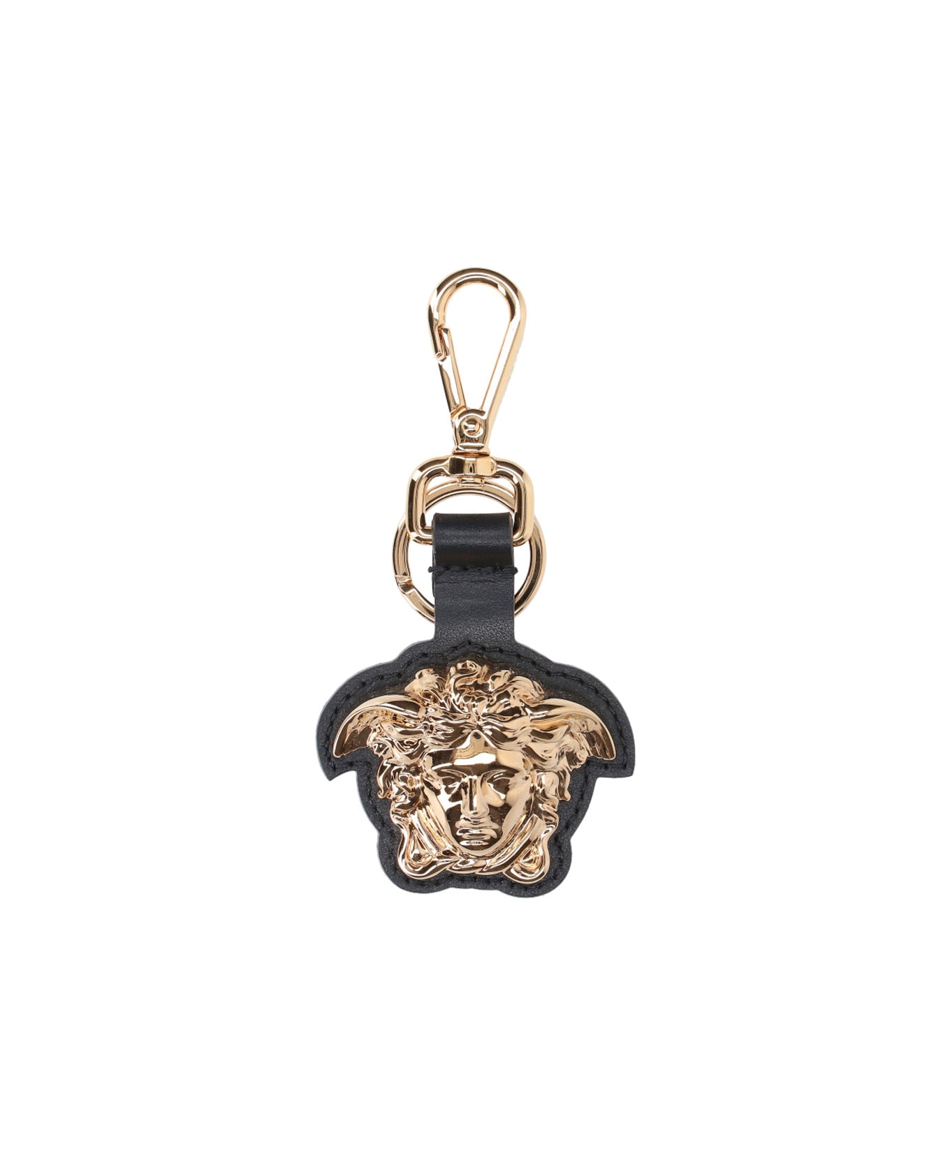 Versace la medusa keyring in black calf leather, gold metal 'medusa' detail on the front, gold metal snap hook, embossed logo on the back. Composition: 100% Calf Leather