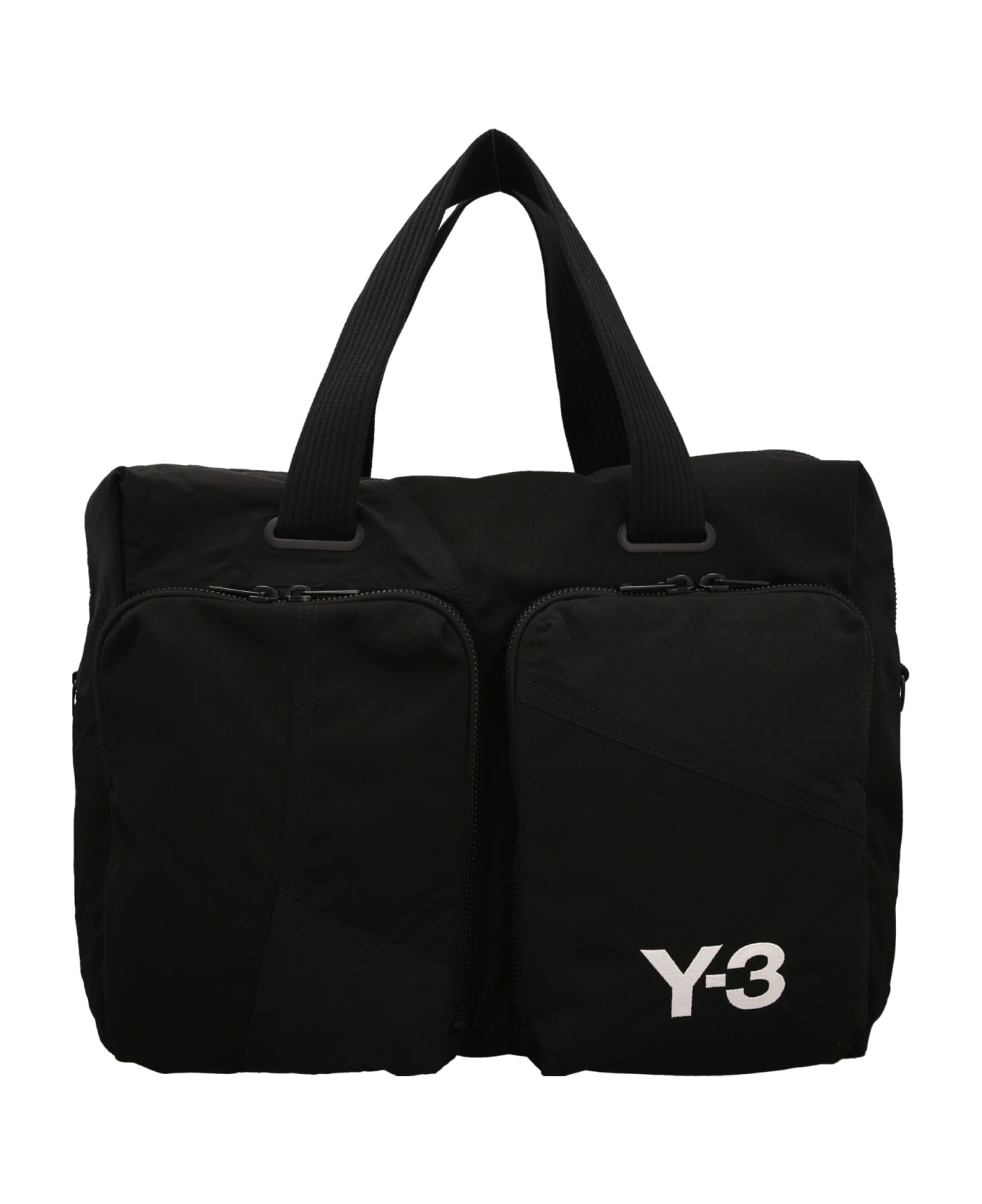 Multi material duffel bag with front embroidered logo, zip closure, external zipped pockets, double handle and awith adjustable and removable shoulder strap.