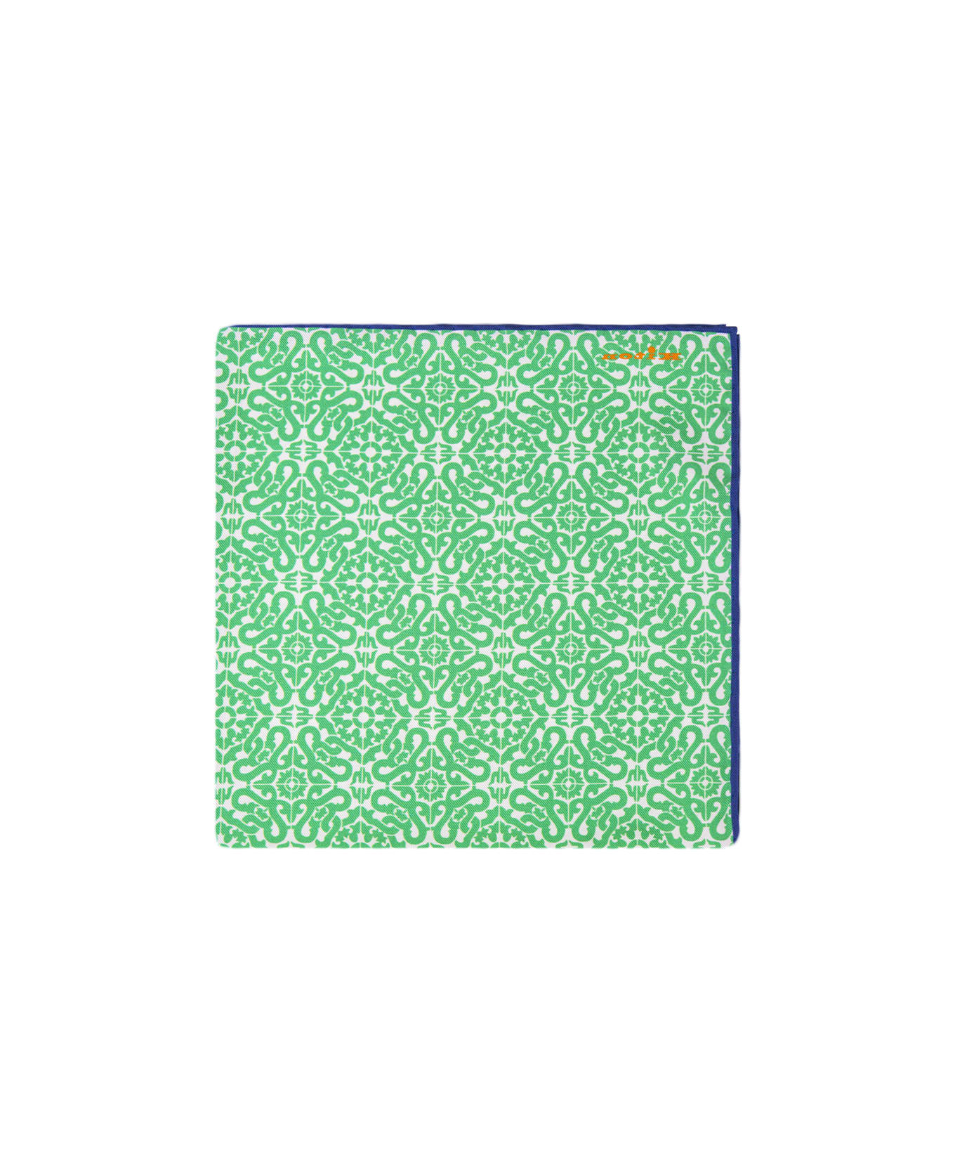 Kiton pocket handkerchief in white silk with blue border and light green majolica pattern print. Composition: 100% Silk