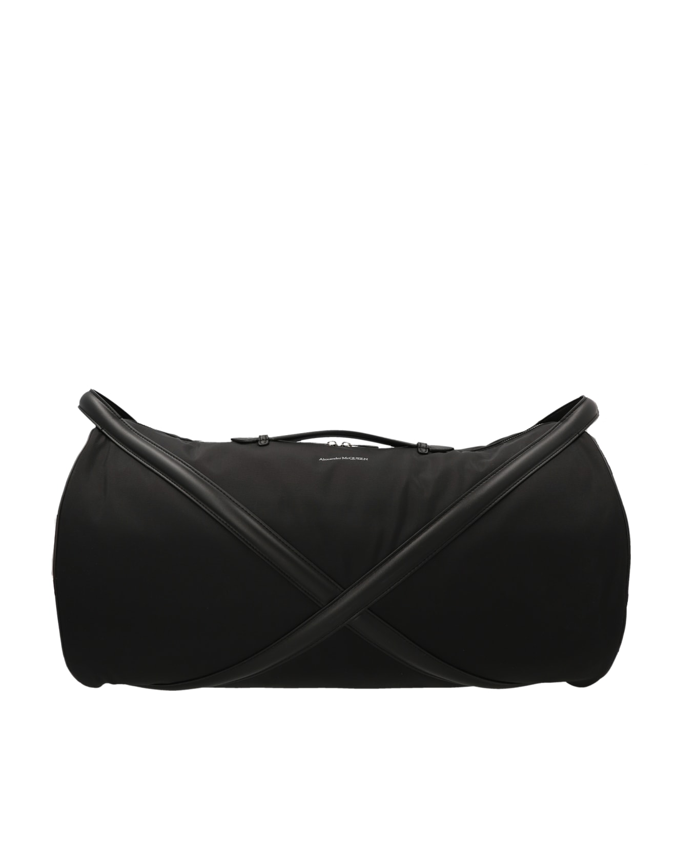 The Curve' duffel bag in tech fabric with leather details, front logo print, zip closure, n adjustable and removable leather shoulder strap and leather handles. Composition: